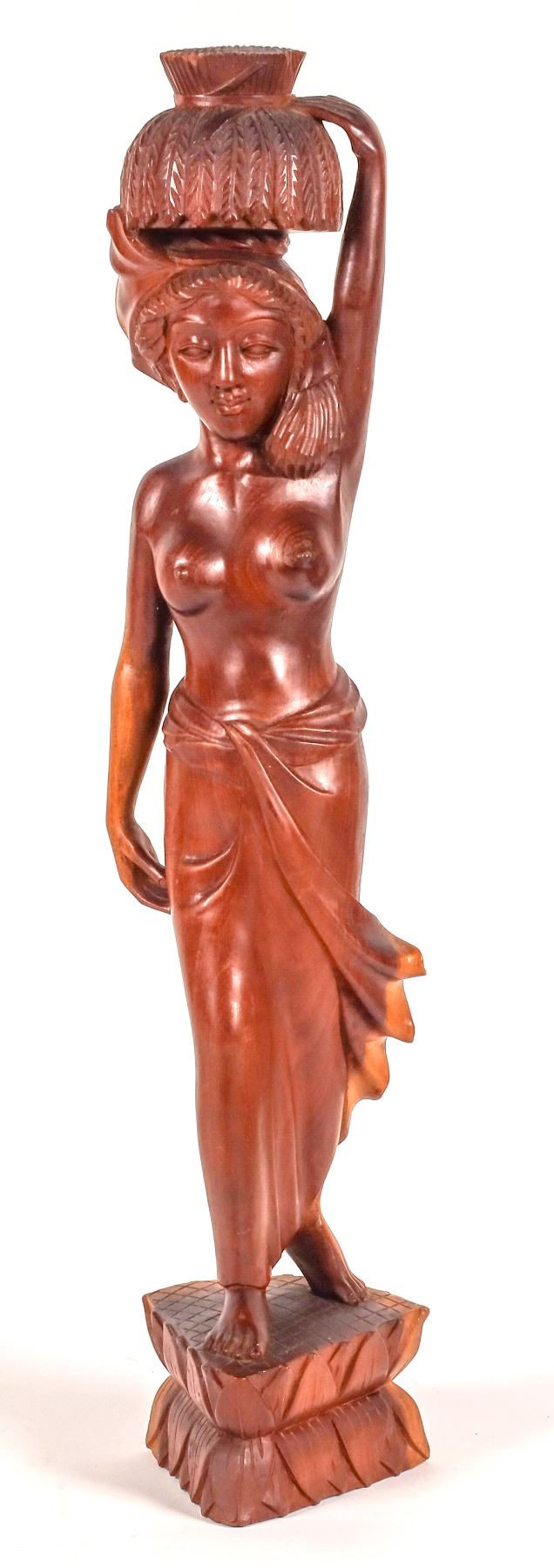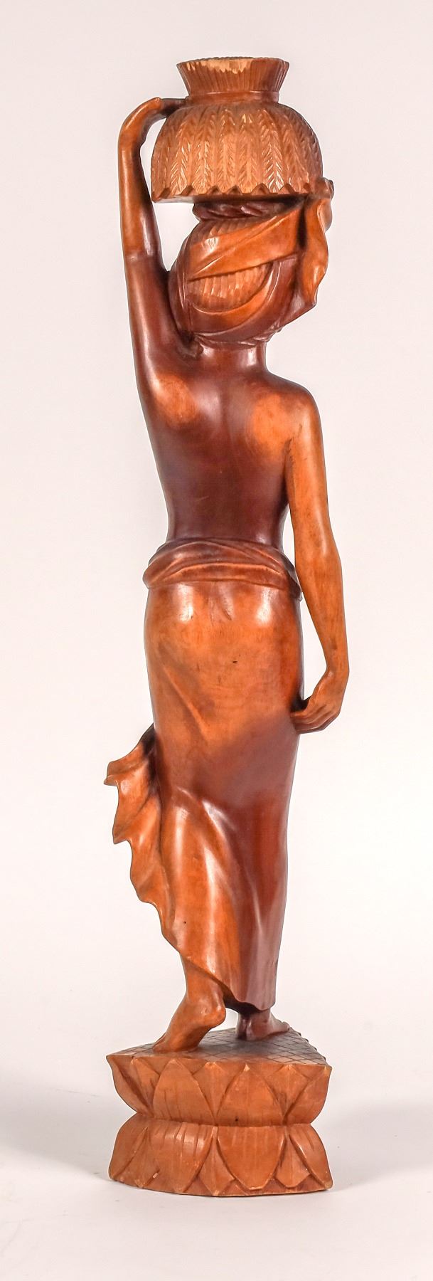 Carved high density wood of an Asian lady carrying a feather adorned package on her head. Unsigned. 20x4x4".