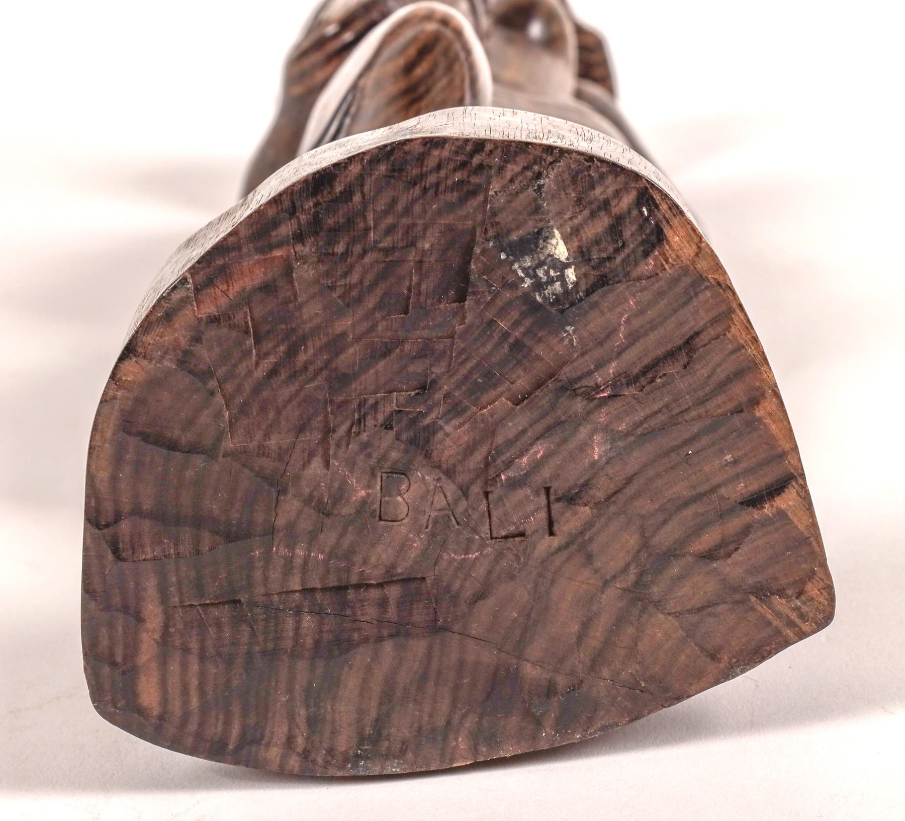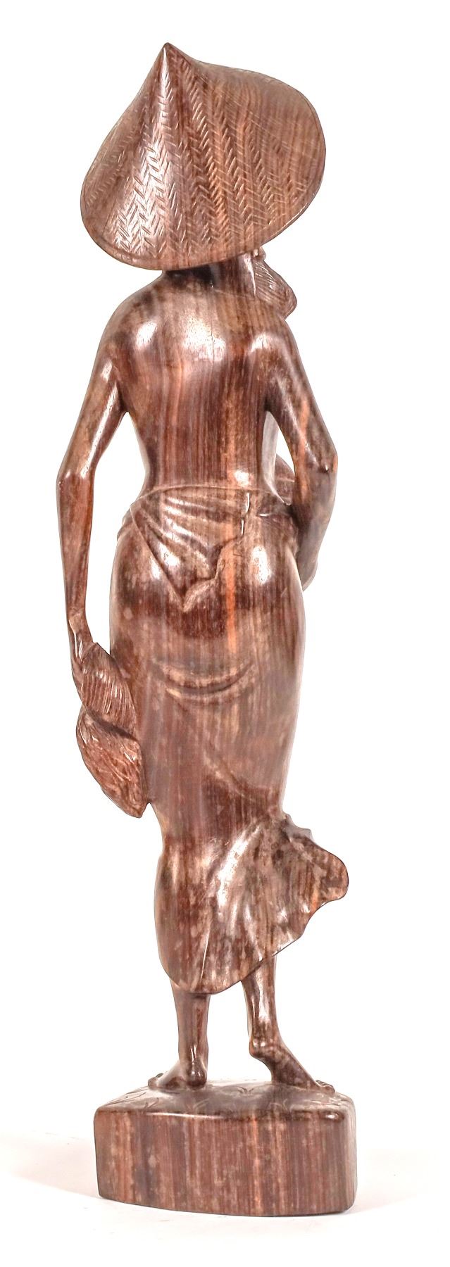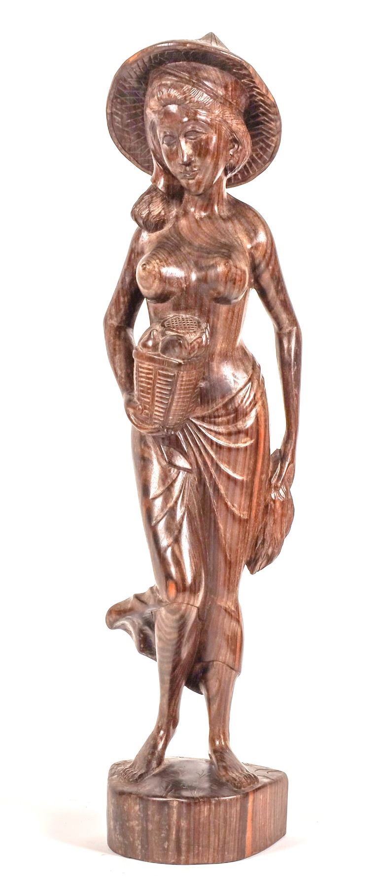 Carved high density wood carving of an Asian lady with a triangular hat holding a basket in her right hand. Nice zebra grained wood. Unsigned, marked Bali on base. 20x4.5x4". Hat has 1" chip.
