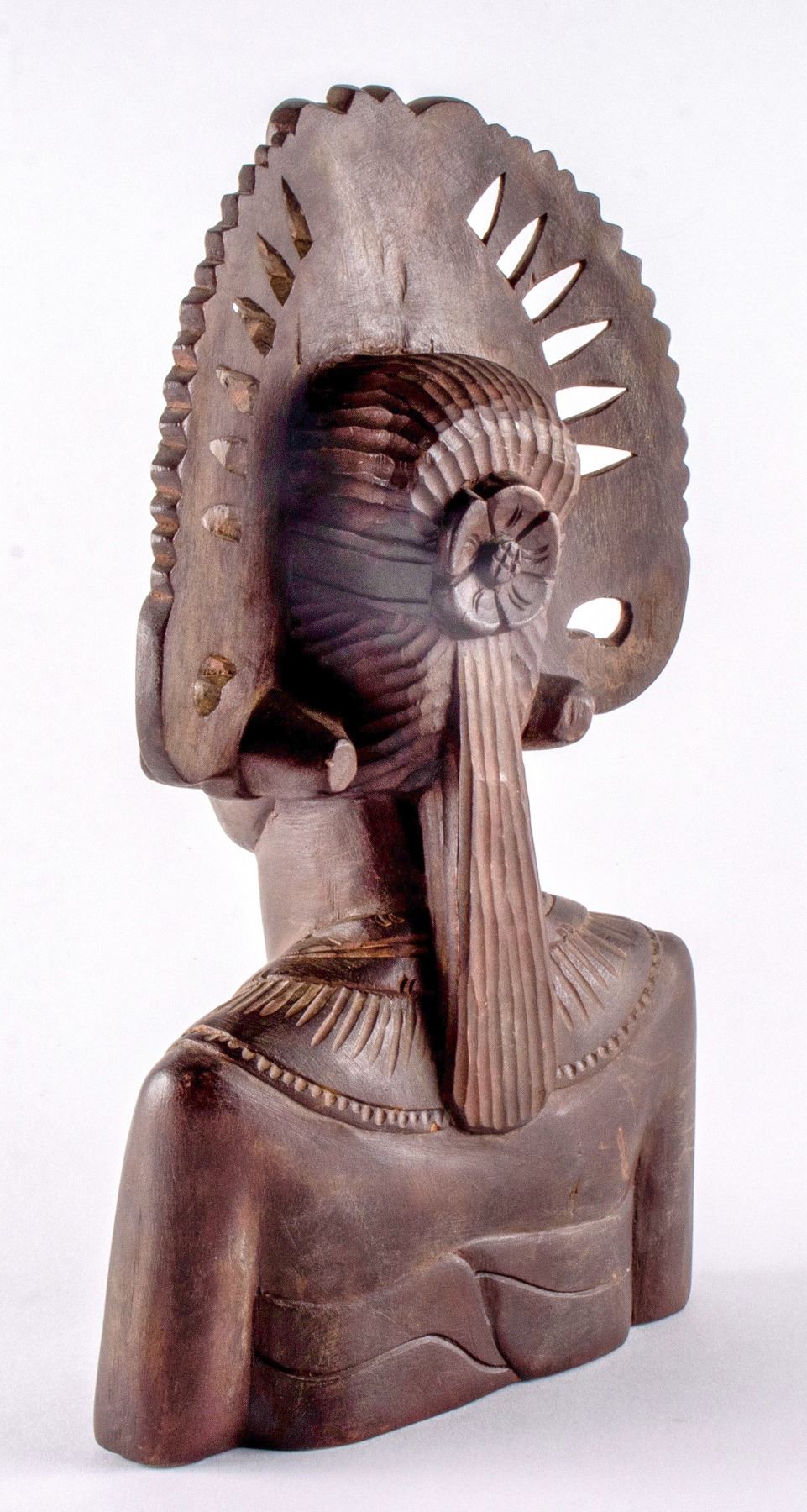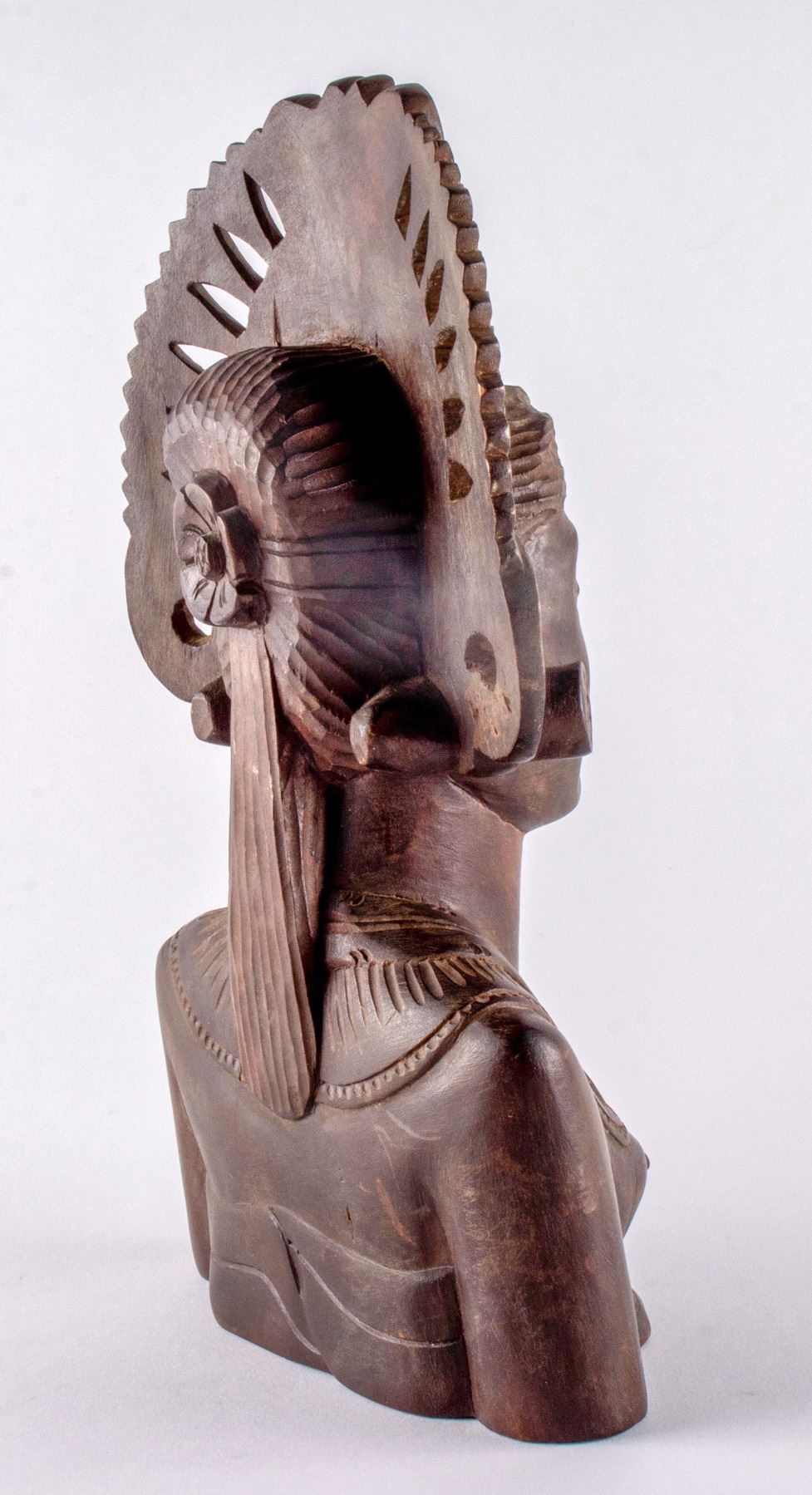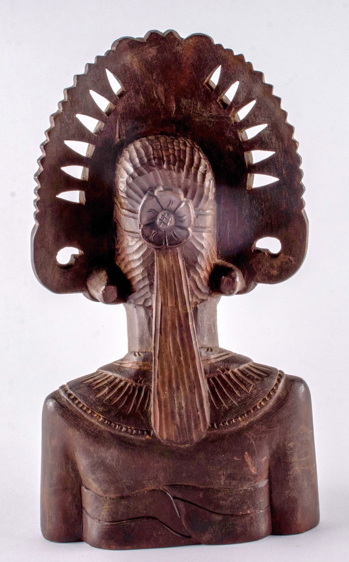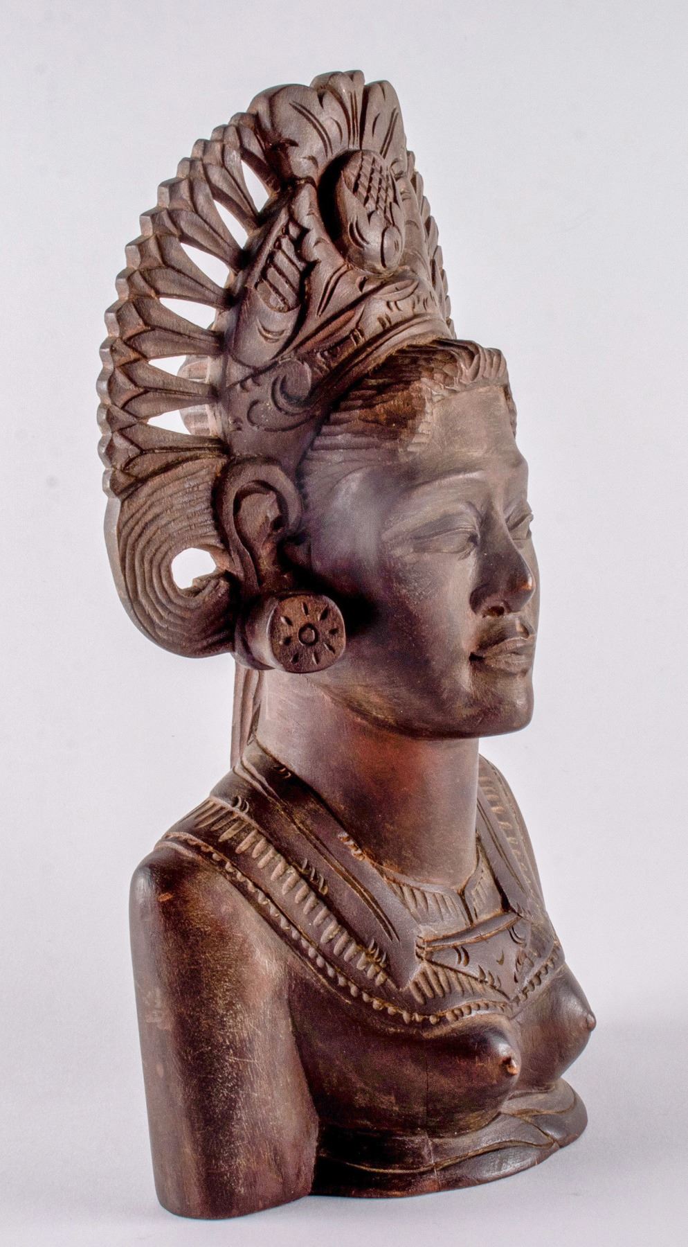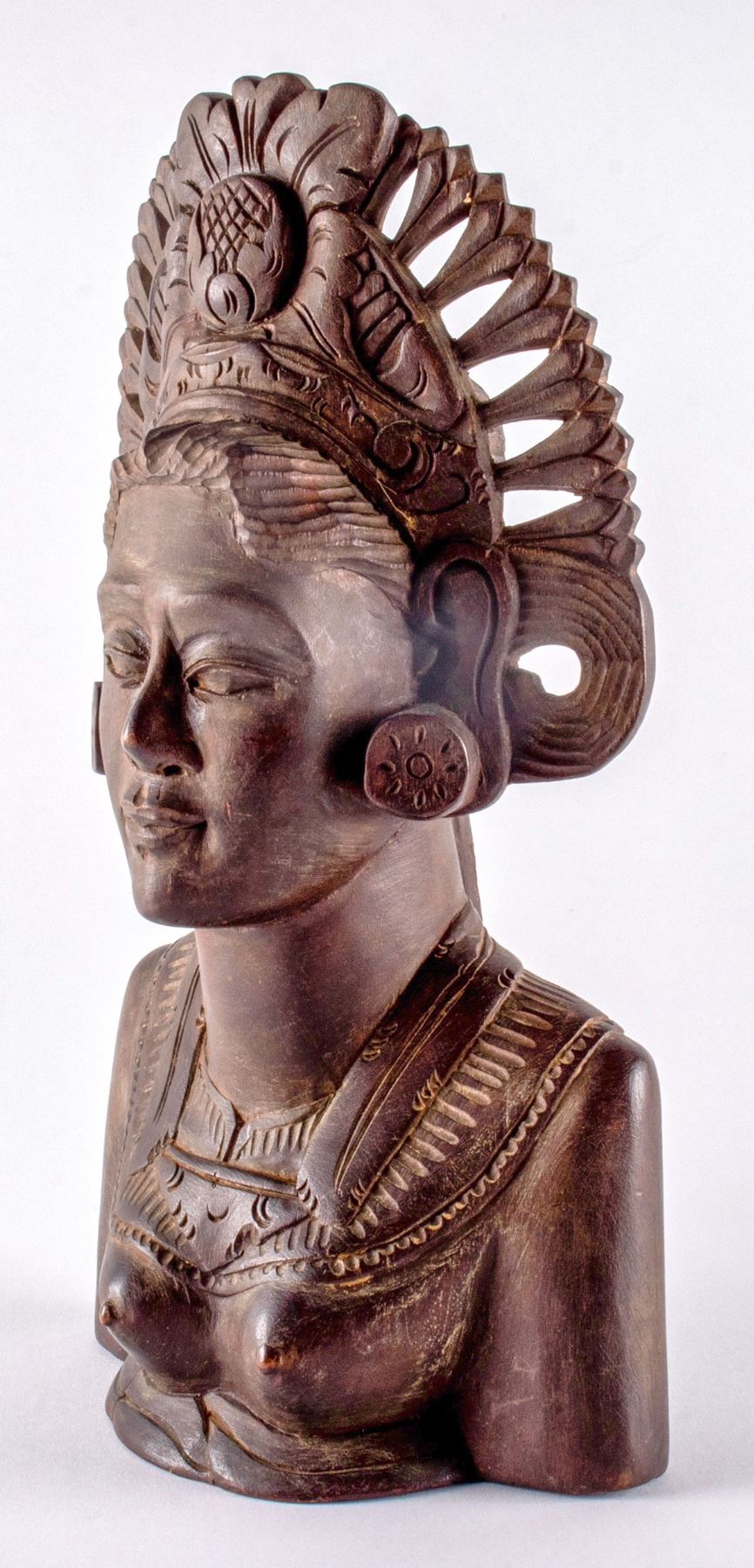 Carved low density brown appearing wood of an Asian lady with a fancy head dress. Unsigned. 10x5.5x4".