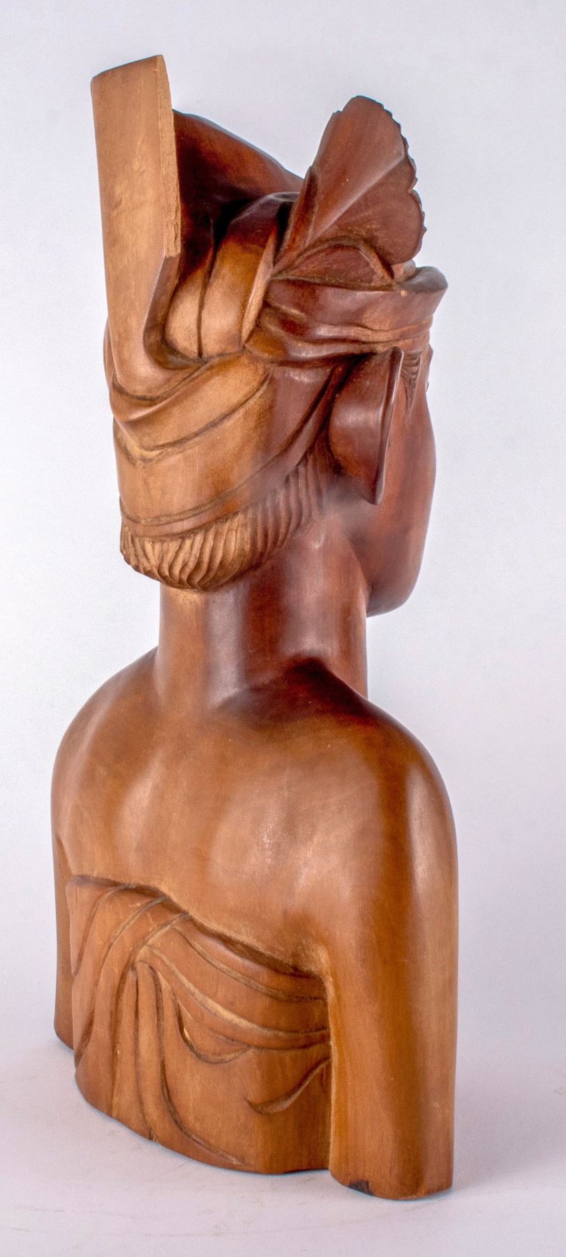 Carved high density brown wood Asian lady sitting with her left hand holding her hair. She is wearing ahead covering and tilting her head toward the right. No marked artist. 13.5 x 8.8 inches