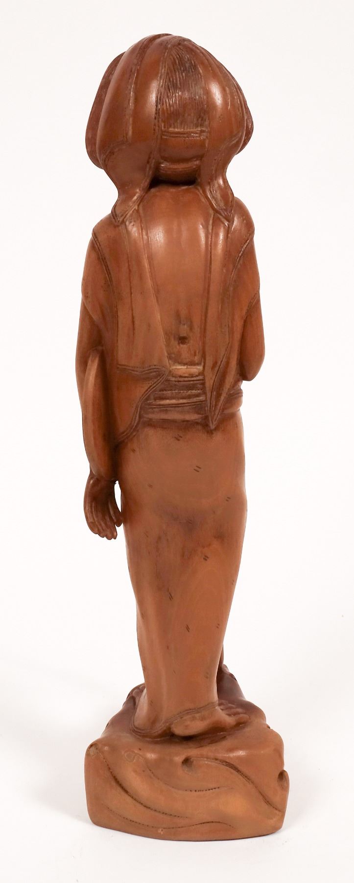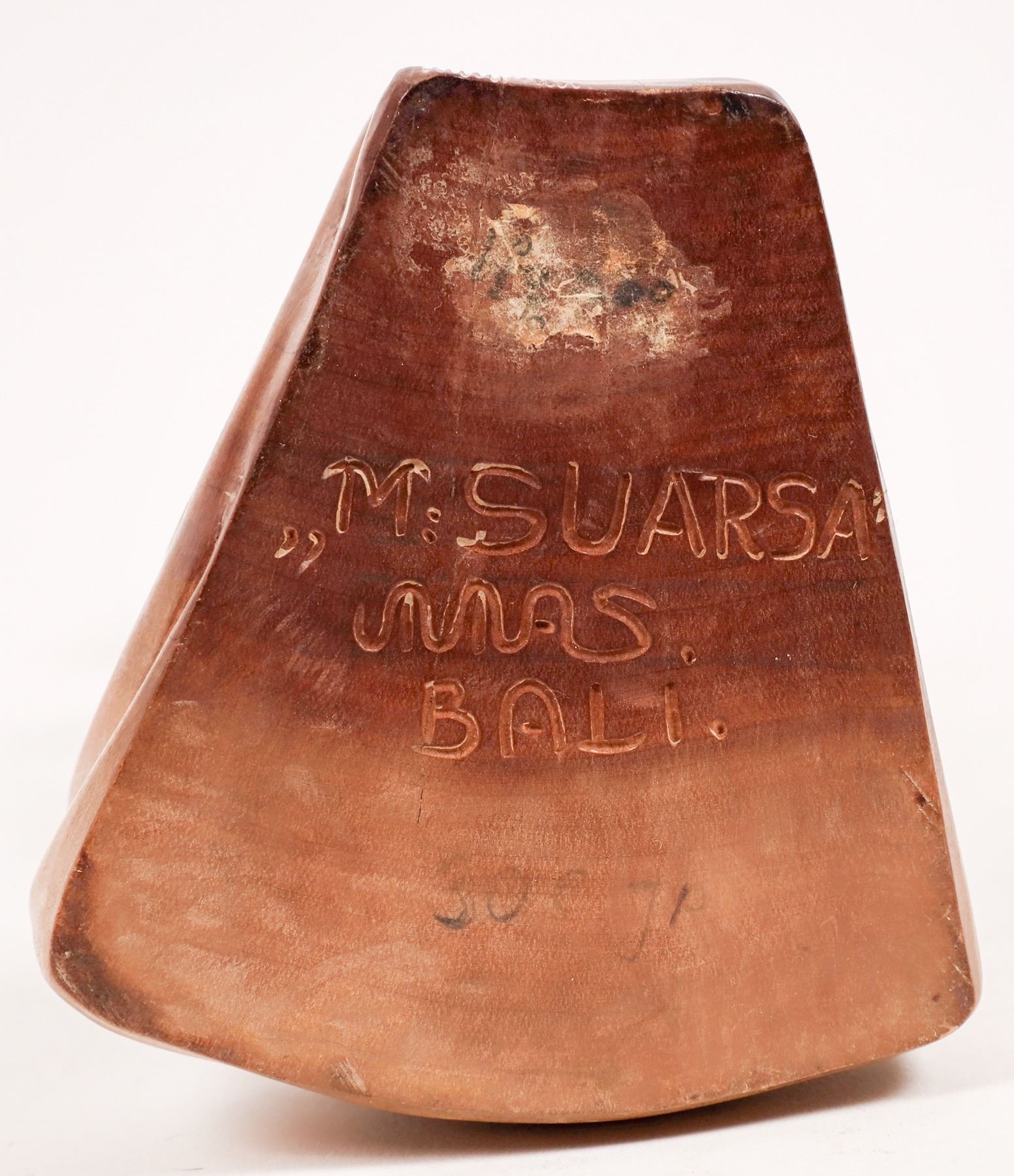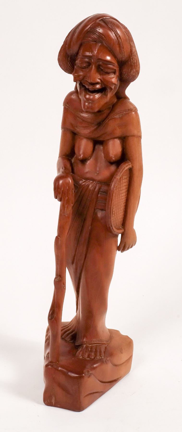 Carved brown wood woman with a cane, signed on bottom M. Suarsa. MAS, Bali. 12x3x3.5"