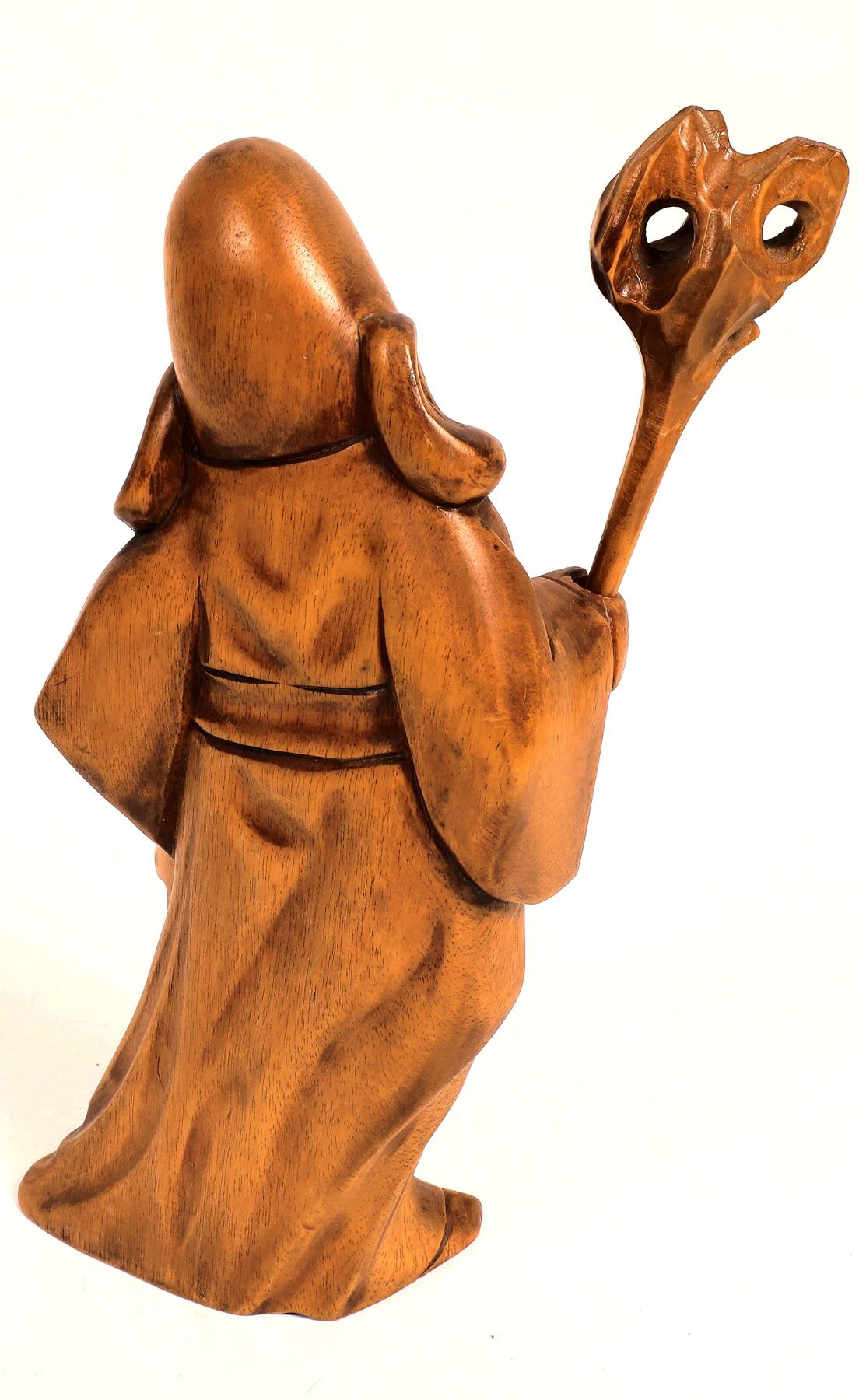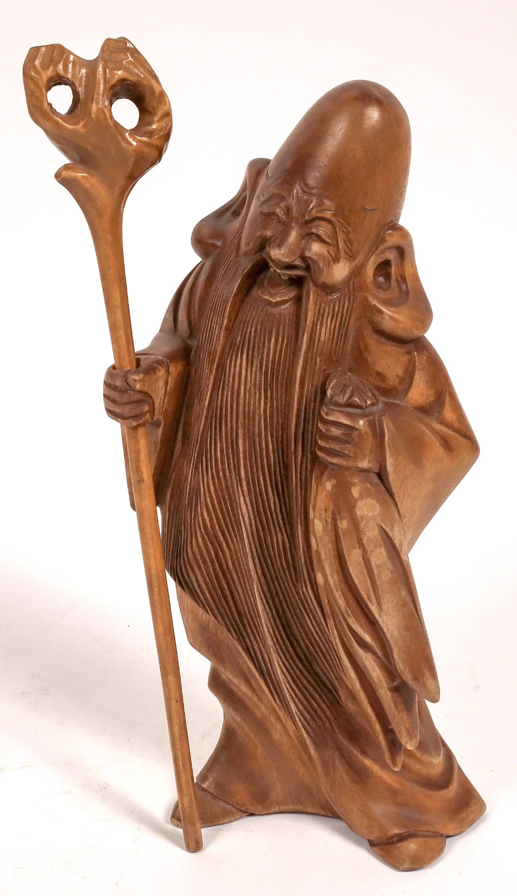 Carved light brown low density wood. Asian man with bald head and big ear lobes holding leaves? in his left hand and a detachable wood staff in his right hand. He is laughing so he must be in a good mood! Man 12.5x5x4", staff 13" long. No marked artist. Small circular indents on hanging leaves, possibly not original. Asia