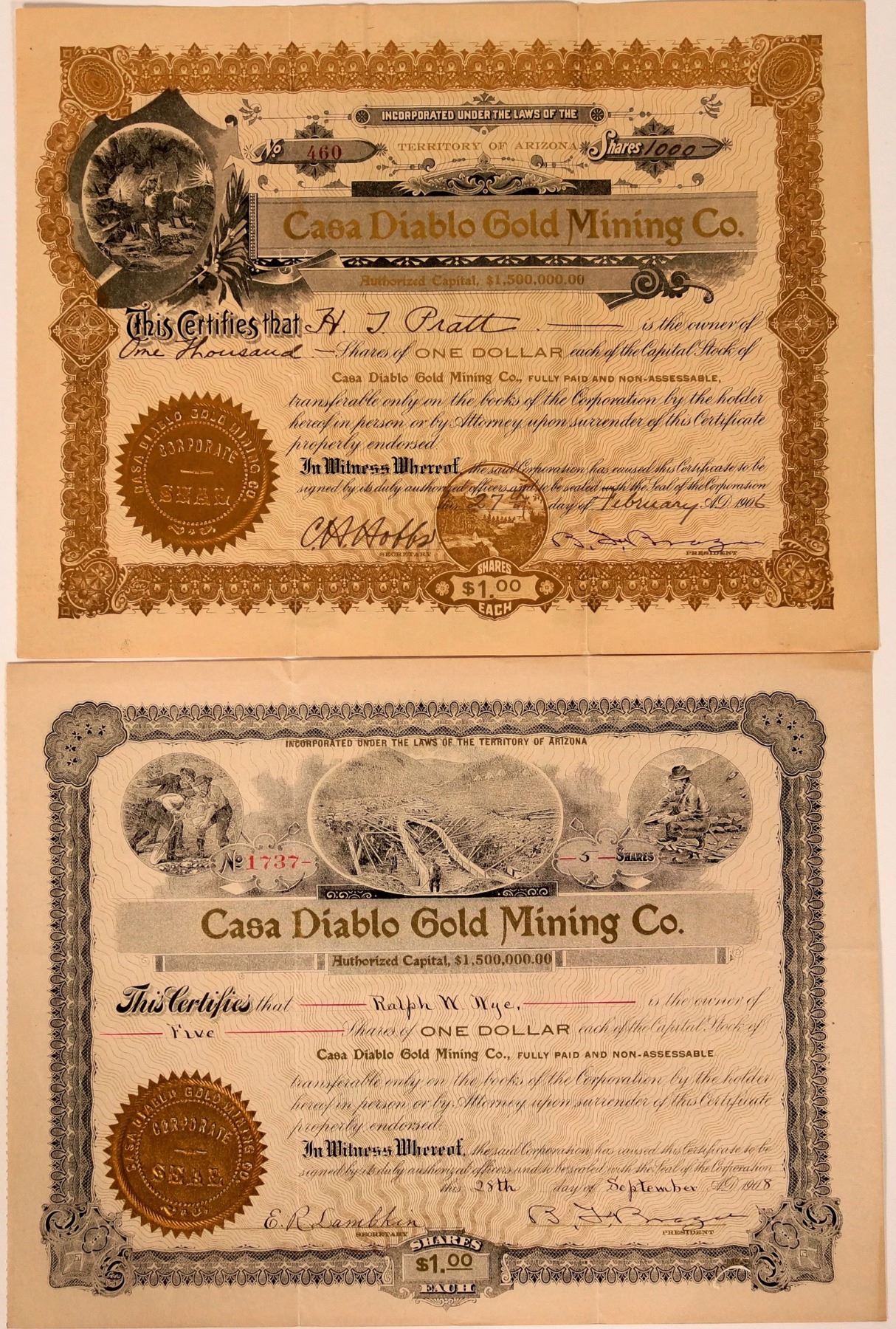 Lot of 2 different. Rare Mono County ghost town mining camp! Inc. in Arizona. 1) No. 460, issued to H. Pratt for 1,000 shares in 1906. Signed by the president BF Brazee and secretary. Not cancelled. Gold border and seal, black and gold print, and a mining vignette. Deep folds, toning. 2) No. 1737, issued for five shares to Ralph Nye in 1908. Same corp. signatures. Not cancelled. Black border, gold seal, black and gold print, and 3 mining vignettes. Deep folds, toning. A 1909 article in the Tonopah Daily Bonanza has the title "Casa Diablo Producing Bars of Bullion" and describes the mill in production with 40 men employed, including 26 underground. Not listed in the 1908 or 1909 Copper Handbook. The 1910 Mines Directory describes it as being in the Sherwin District, Mono County. They are 24 miles from the railroad and have 19 unpatented claims. They have a 10-stamp mill, boarding houses, a hydro-electric plant, and an 80 acre townsite. Developments include a 700 ft. tunnel and several thousand feet of drifts. (pg. 150) City: Mono County, Casa Diablo State: California Date: 1906, 1908