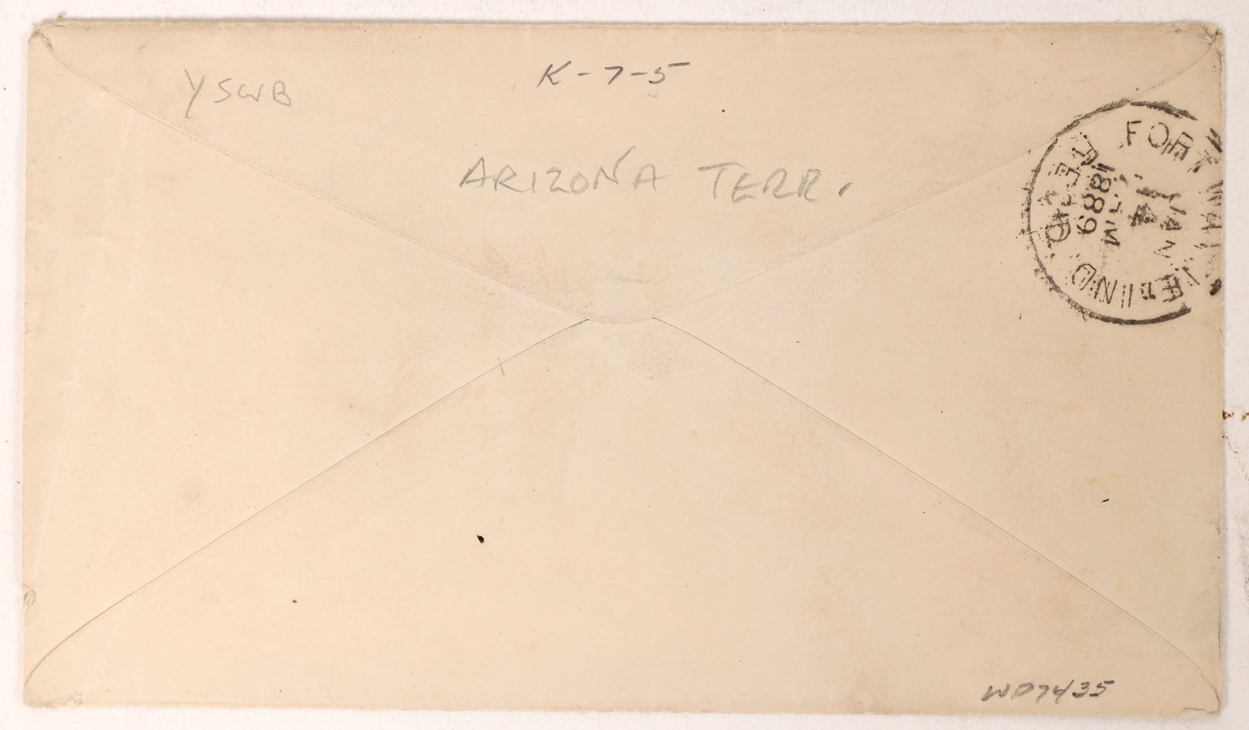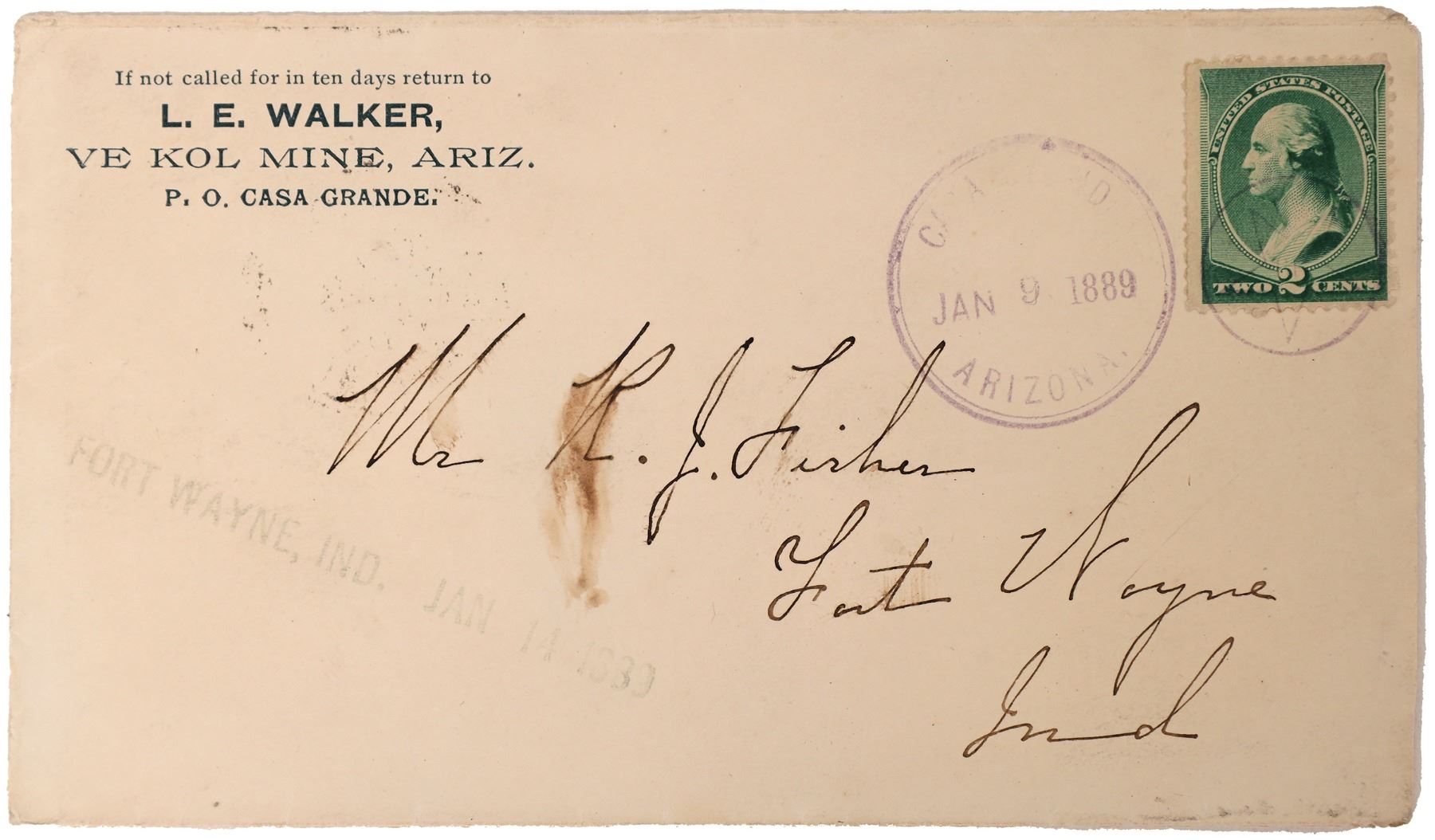 Postal cover postmarked Casa Grande Arizona Jan 9, 1889. from L. E. Walker, Ve Kol Mine to Mr. R. J. Fisher Fort Wayne Indiana. Green two cent stamp (Sc#213) bullet cancelled. The Vekol mine, located on the Tohono OíOdham reservation southwest of Casa Grande,operated between 1885 and 1916. The silver mine was run by John D. Walker and Peter R.