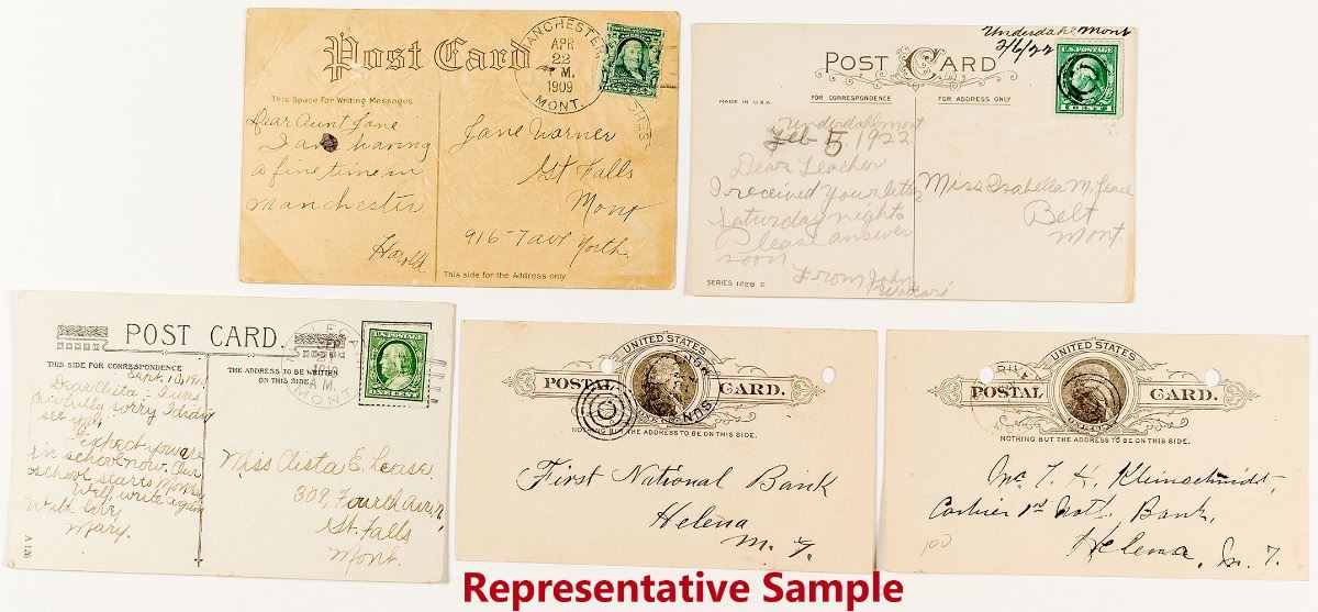 47 Total pieces. Best pieces are a 1922 Underdahl manuscript (1921-1928), 2 Sun River Territorials, and a 1909 Manchester (1904-1911). Also includes Sand Coulee, Belt, Saint Peter last day, Salem, Hardy, Monarch, Underdahl stamp cancels, Ulm, Millegan, Stockett, Simms, Riceville, St. Clair, St. Peter, Neihart, and Millegan cancels. City: State: Montana Date: Inventory# 38576