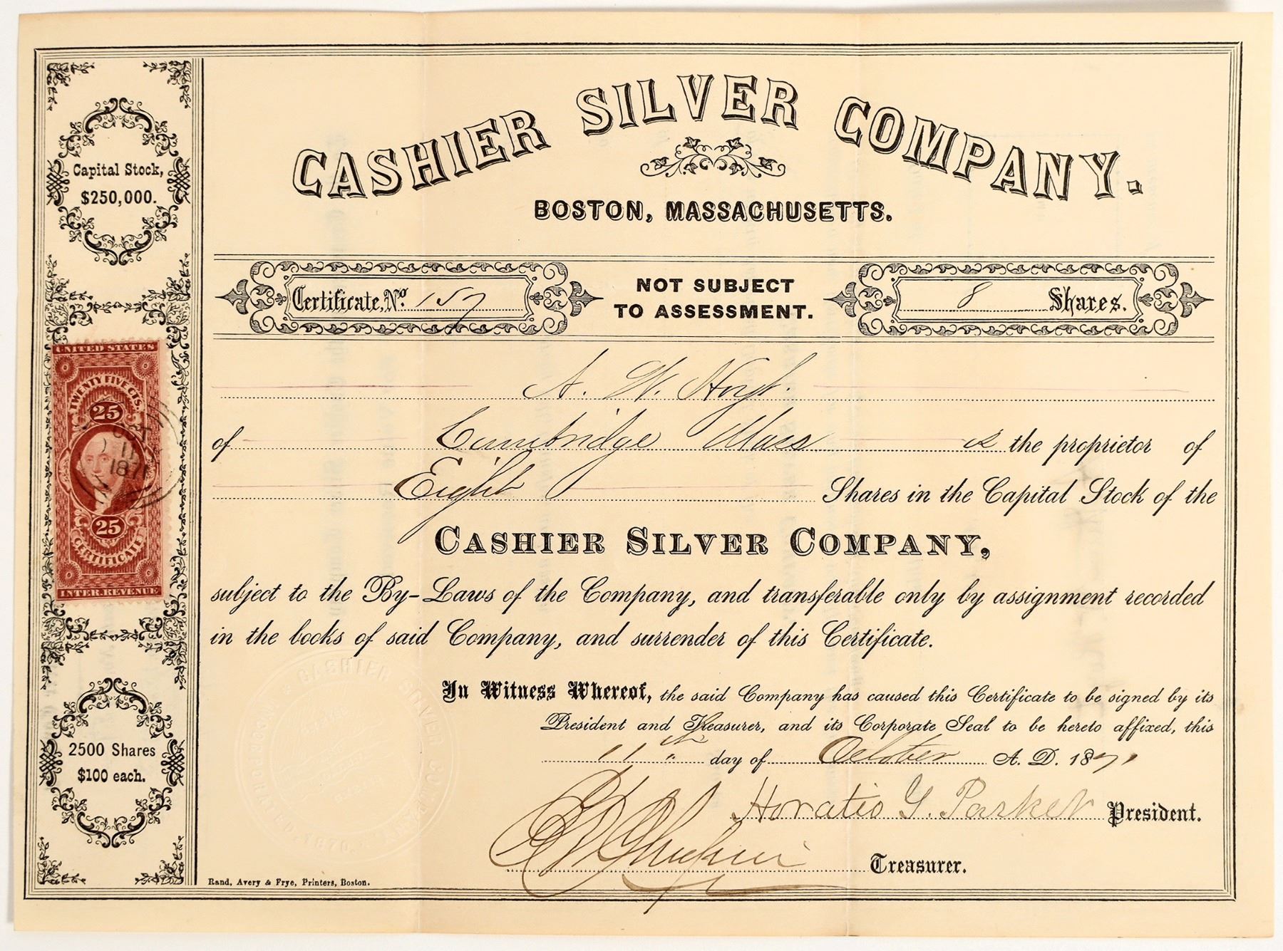 Rare. Never seen by us. No. 157, issued for 8 shares to AW Hoyt in Massachusetts in October 1871. Signed by president Horatio Parker and the treasurer. Not cancelled. Black border and print, 25 cent revenue stamp. 6.75 x 9" Folds. In 1877, they were buying feet on the Blue Jacket Lode, Downieville district, Clear Creek County, Colorado. We also see mention of them owing the Cashier Silver Lode.