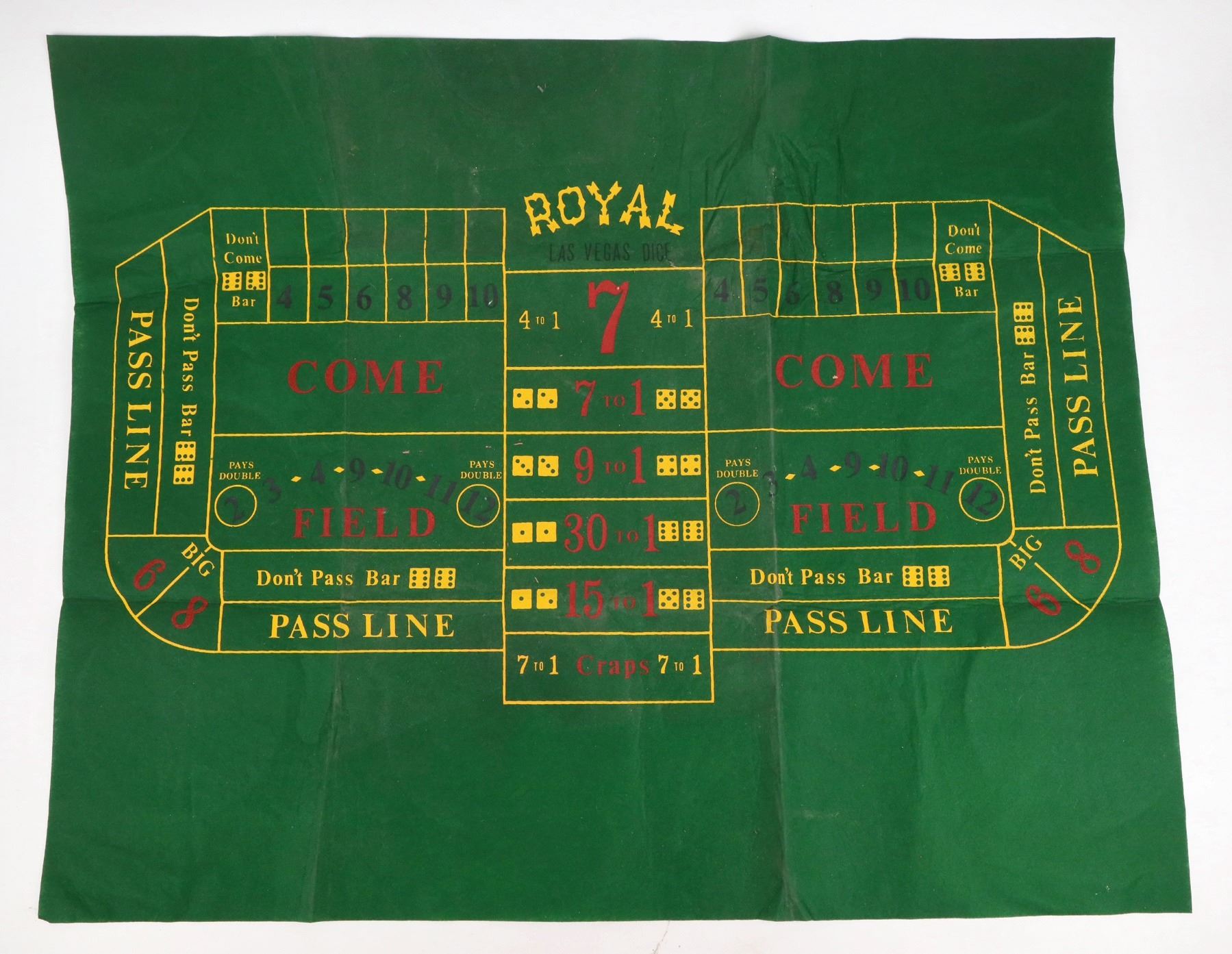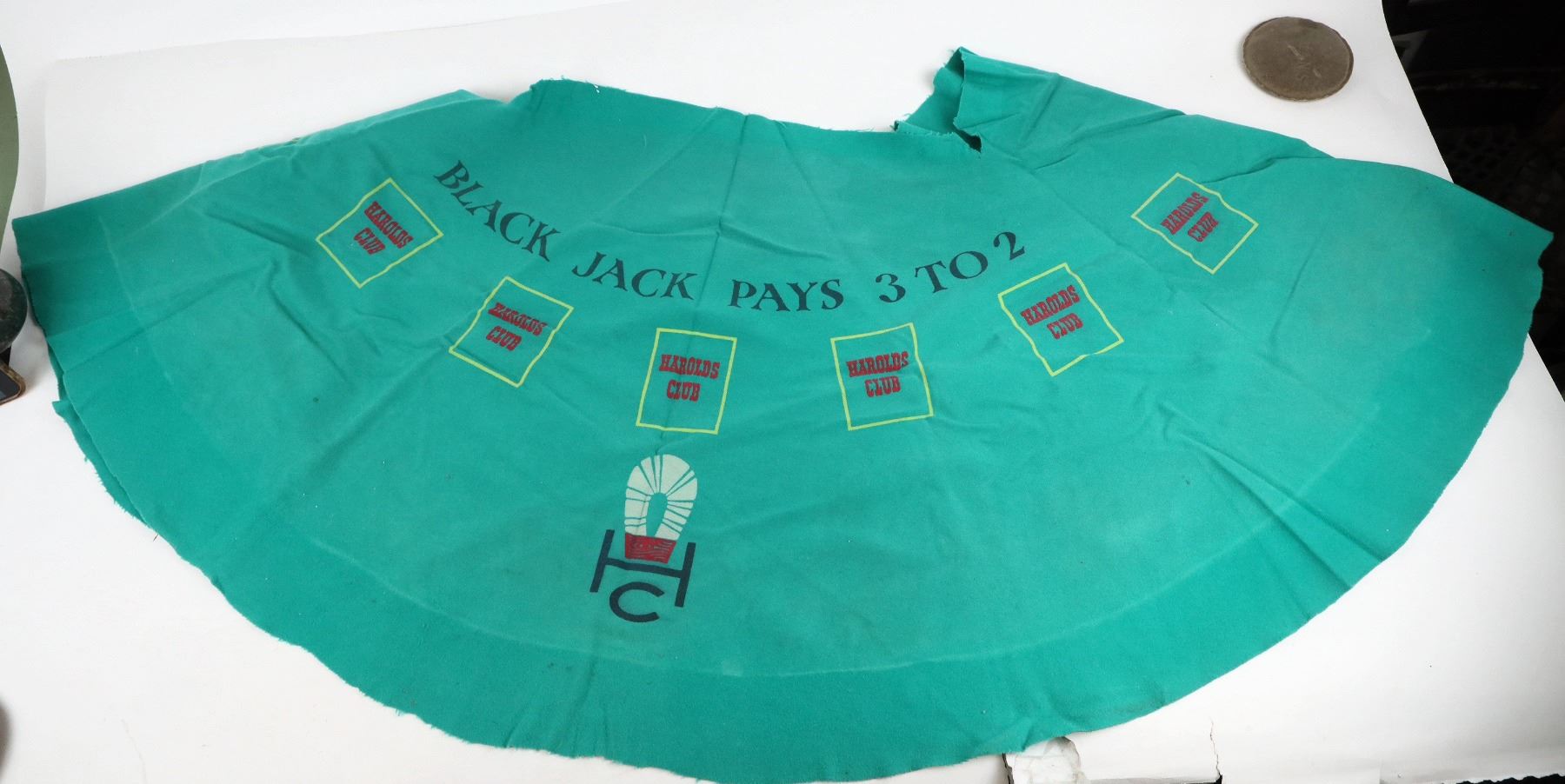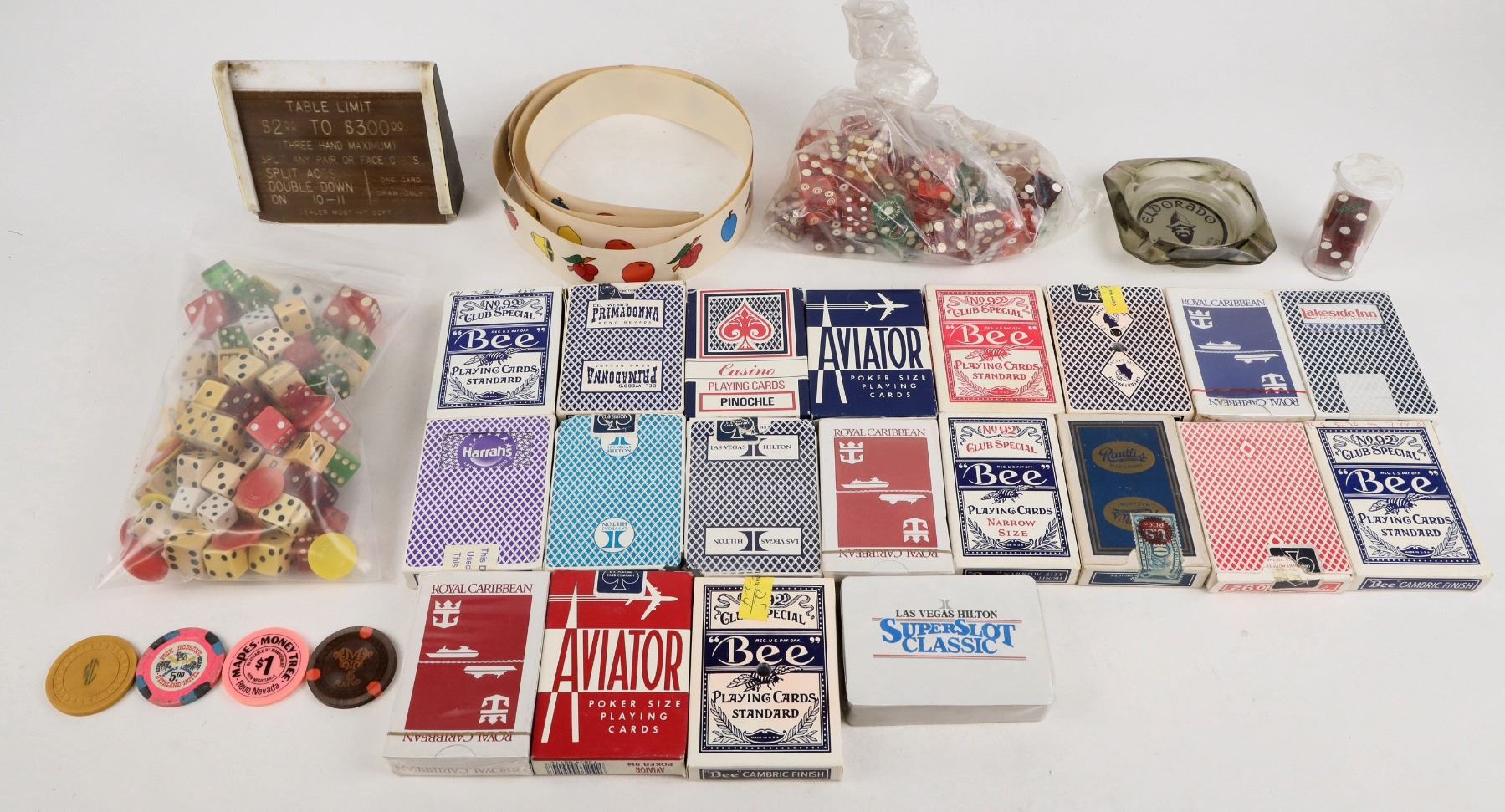 75+. Craps and Blackjack cloth tops. 20 decks of cards, table limit sign off blackjack table, reel characters from slot machine, dice (lots) some with the markings of the casino, Eldorado ash tray,. Get a license, open a small casino.