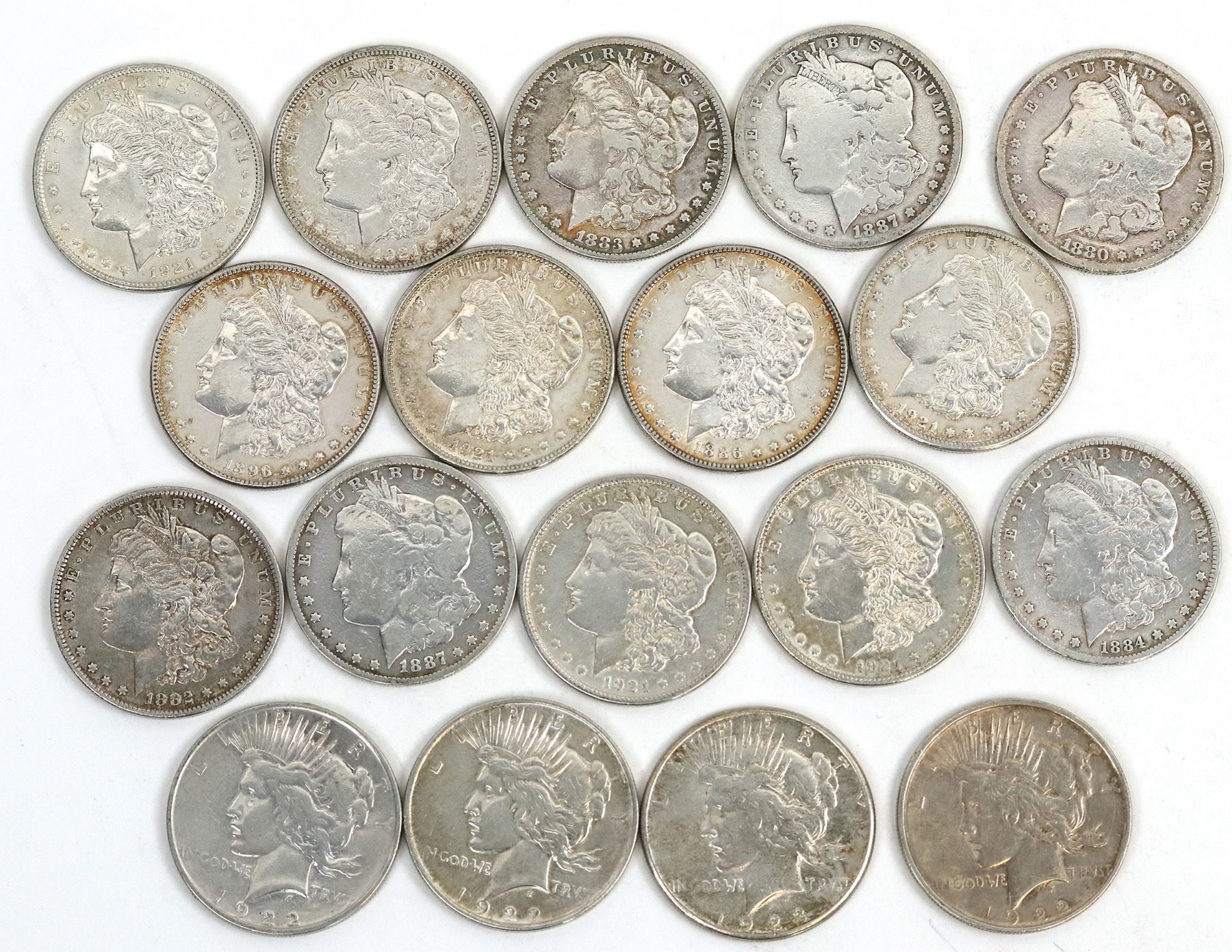 Real United States silver dollars polished to be given out in slot machines as jackpots in the 1970s. Eighteen coins: 14 Morgans, 4 Peace.[ Nevada