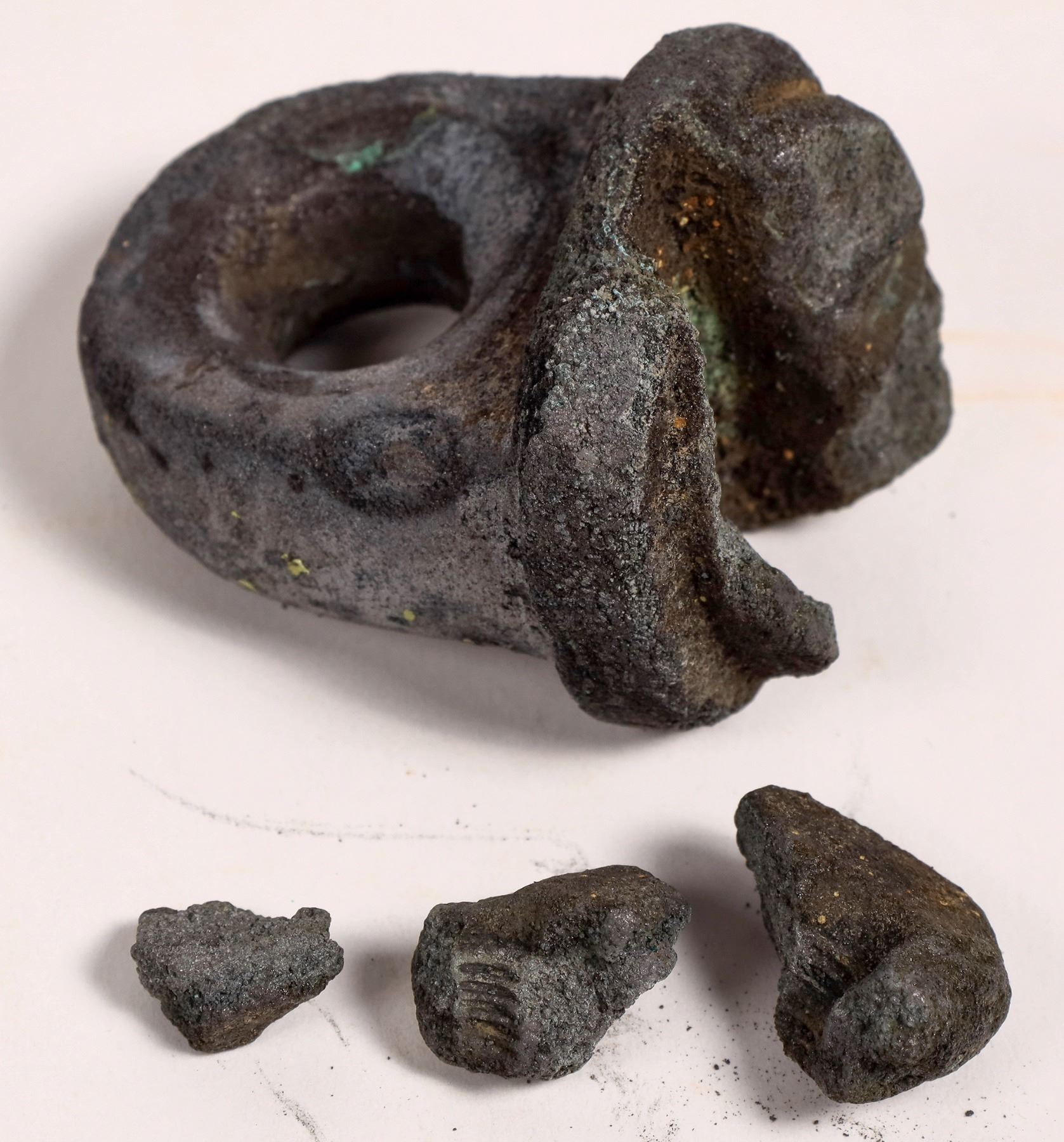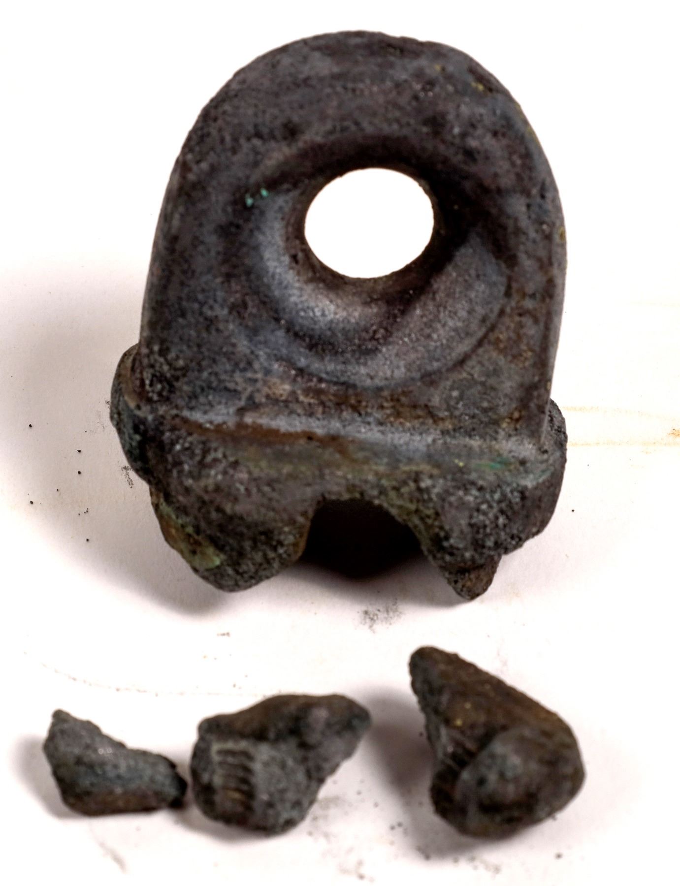 Cast Iron Tie Point. 2" long from wall or attachment point, 1.5" wide with a half inch hole for the rope. Dark black, iron degraded but generally intact.