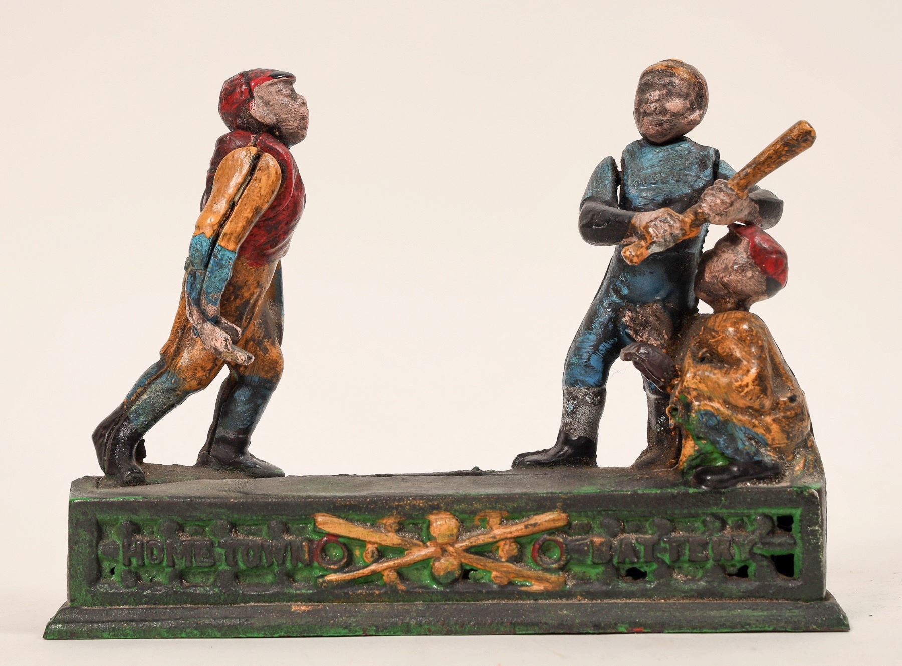 Home Town Battery Cast Iron Bank possibly by Steven’s. Mechanically works very wel, paint shows wear for its age. This is large : 9 X 6.5 X 3 “. No Cracks or chips. Overall excellent cond. for age. [ Cast