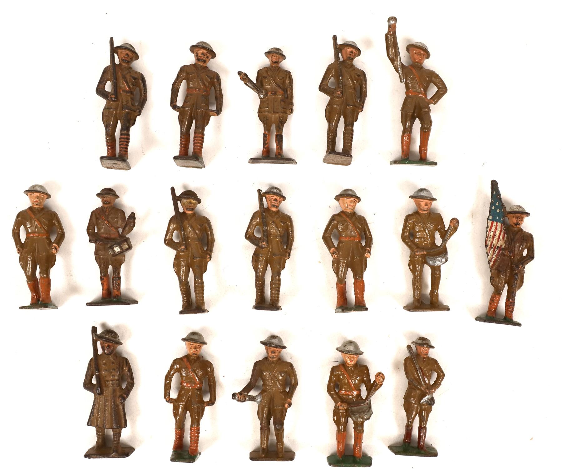 17 lead military parade toy soldiers, about 3.25x1.25".see photo. c. 1925-35.