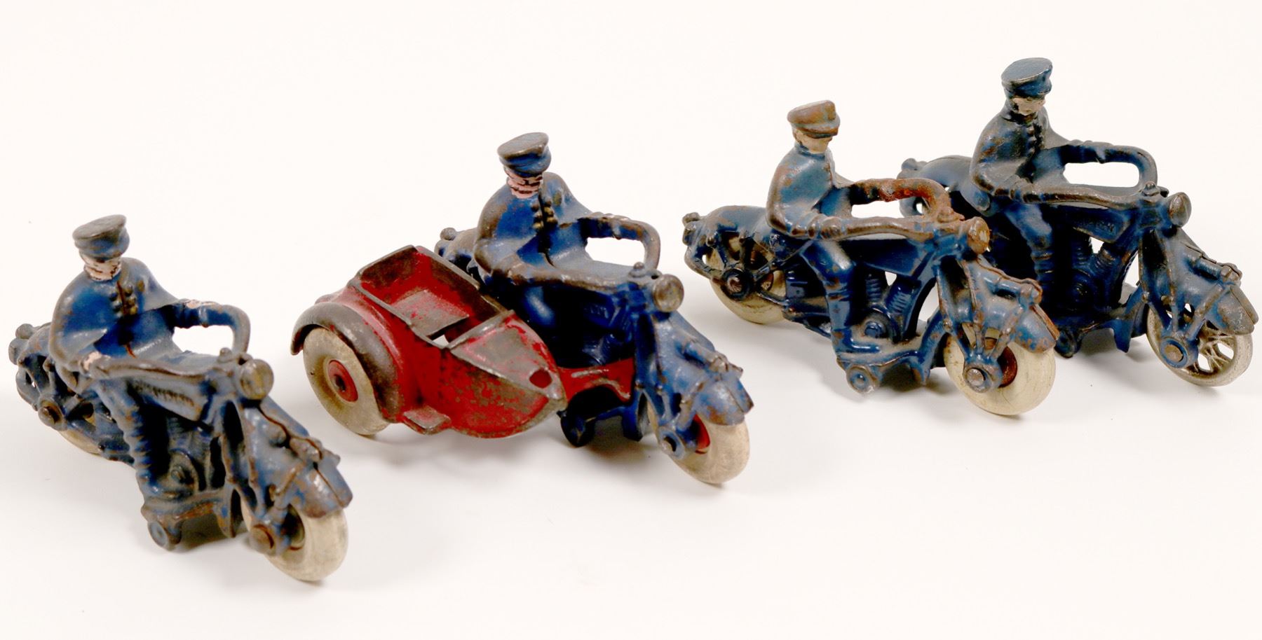 4 cast iron motorcycle cops. 3 Blue Champion 4.75"-1 has moderate rust. 1 blue Champion with blue sidecar, no rider, some rust, 5".