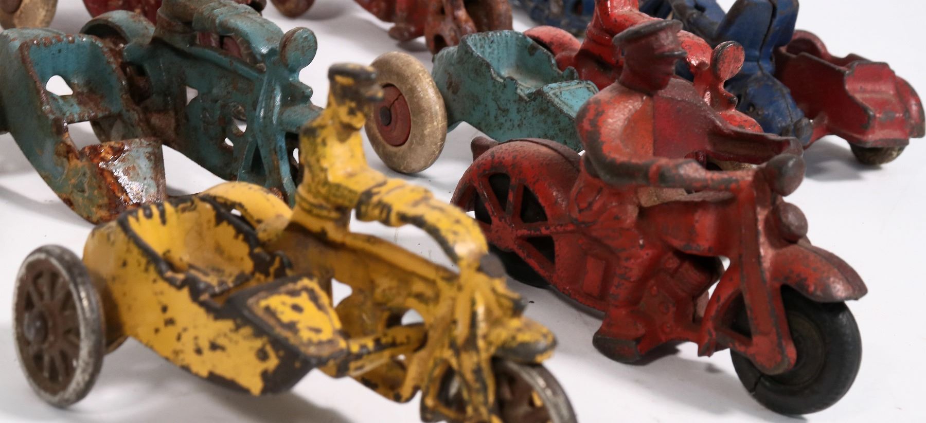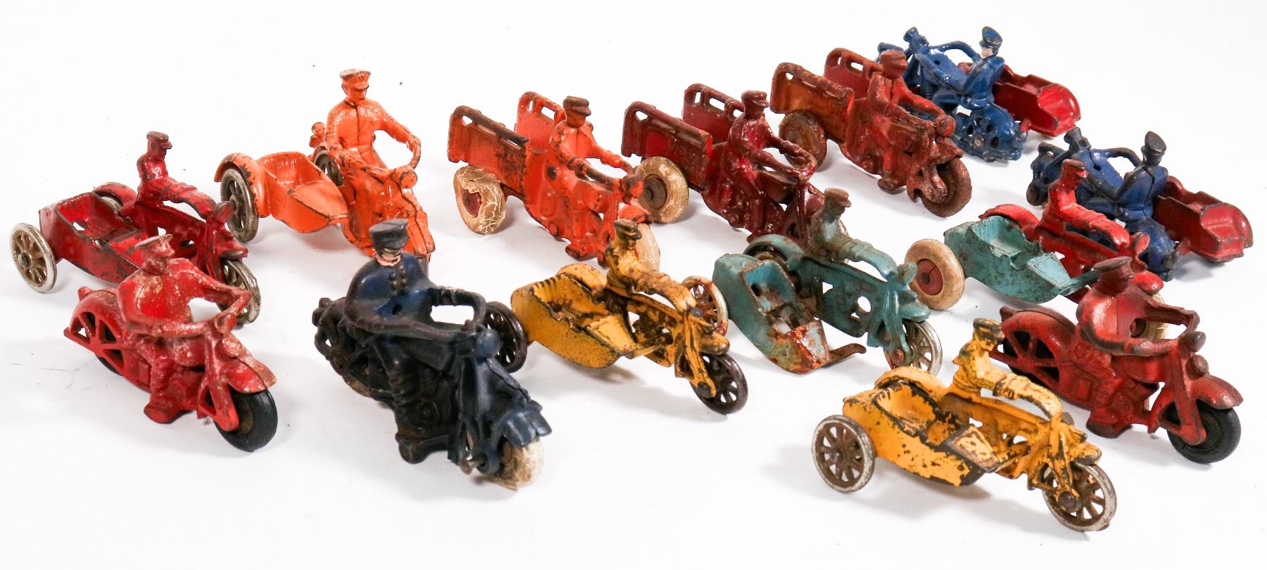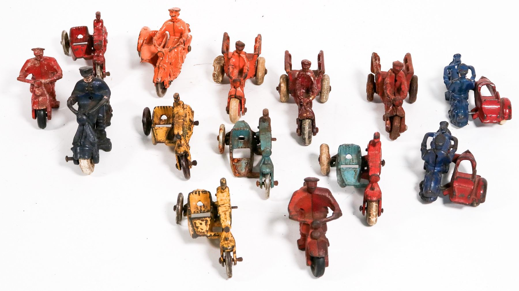 Lot of. 14. All measure 4î or less. Hubley cast iron motorcycles. Three are crash car cycles, Eight sidecars and three single riders. All are complete, show play wear paint. Overall in very good condition