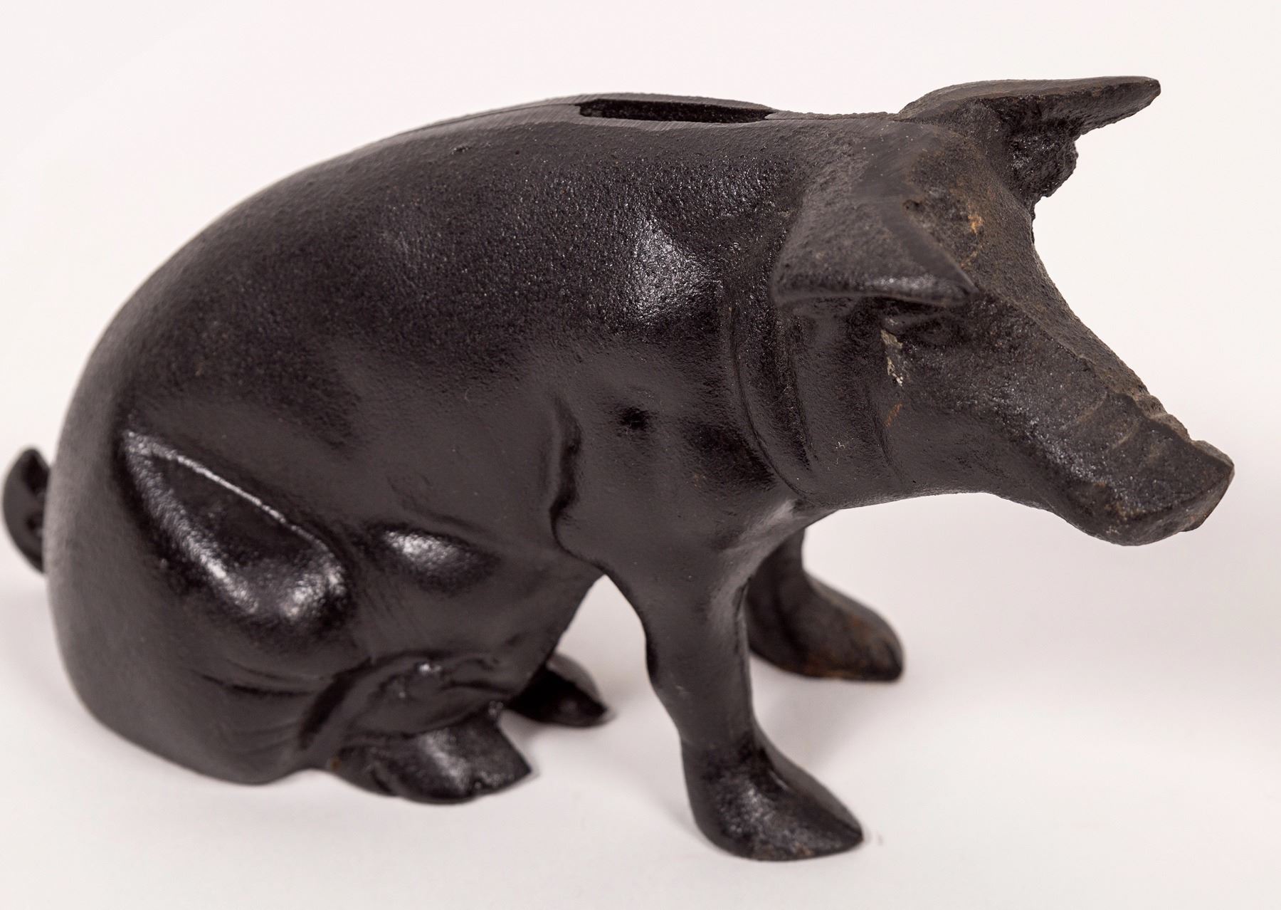 This cast iron piggy bank is painted black without any maker's mark. Please see photos for details. Excellent condition. 4 pounds 11 oz.