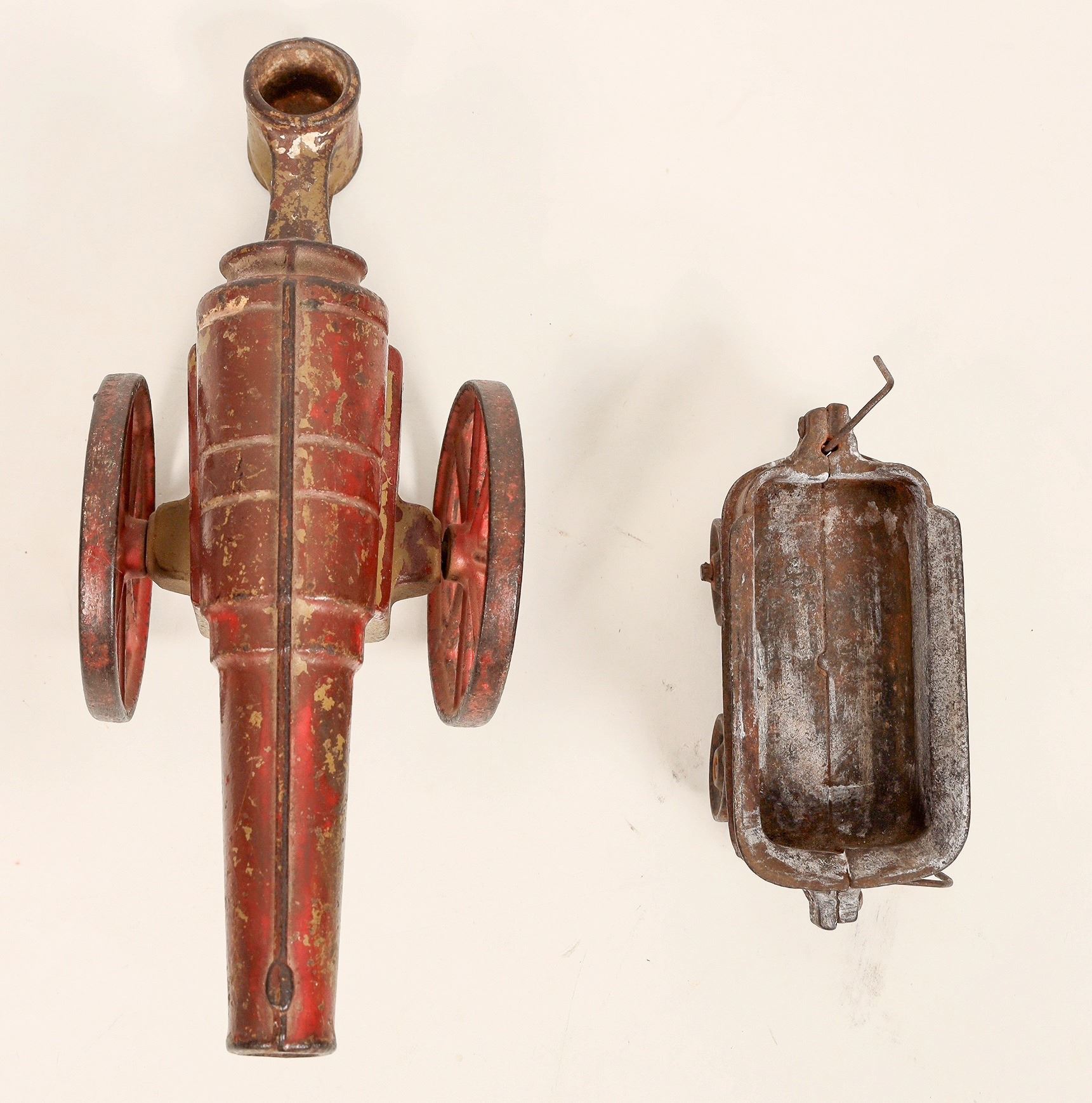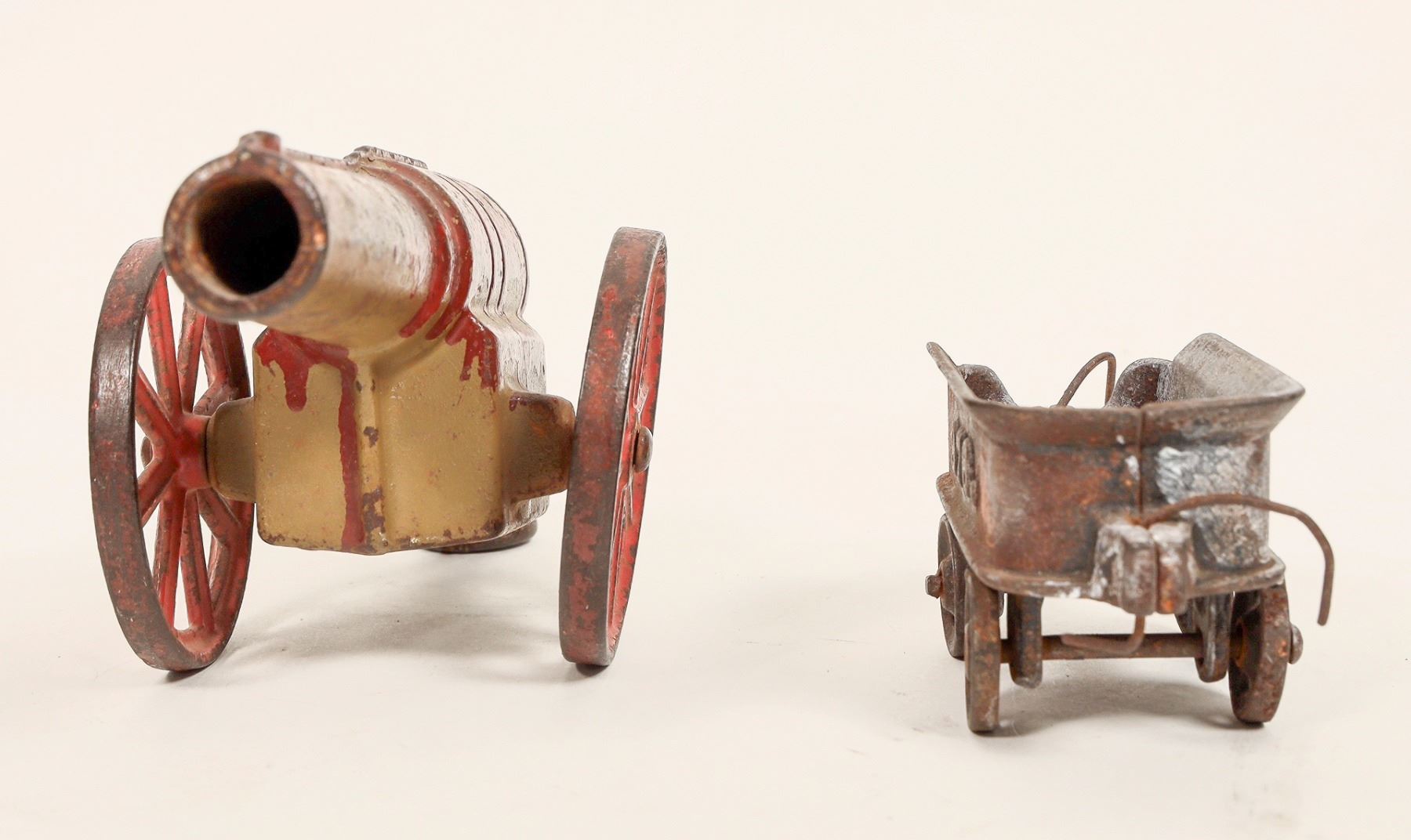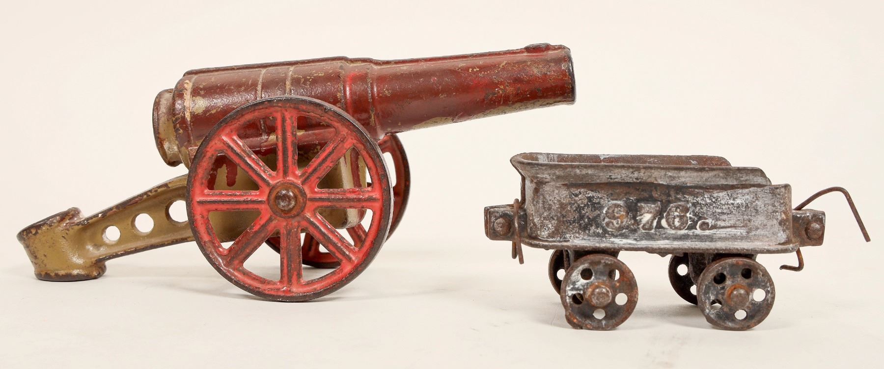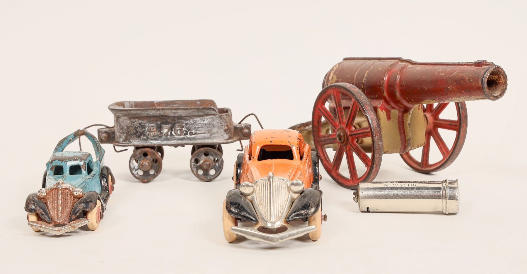Lot of 5. . 1. Cast iron cannon. Burn paint is worn and red is showing. Wheels roll, missing the fillet. 2. Arcade RR gondola cast iron car. Wire couplers. Wheels roll. Has some sort of white residue, rust or patina. Overall good condition. 3. Hurley cast iron Studebaker (possibly ë33). Orange/black w/ very light wear. White rubber tires w/ red centers that roll, hover no cracks or damage including the spare. 4. B7P MFG. dime counter .