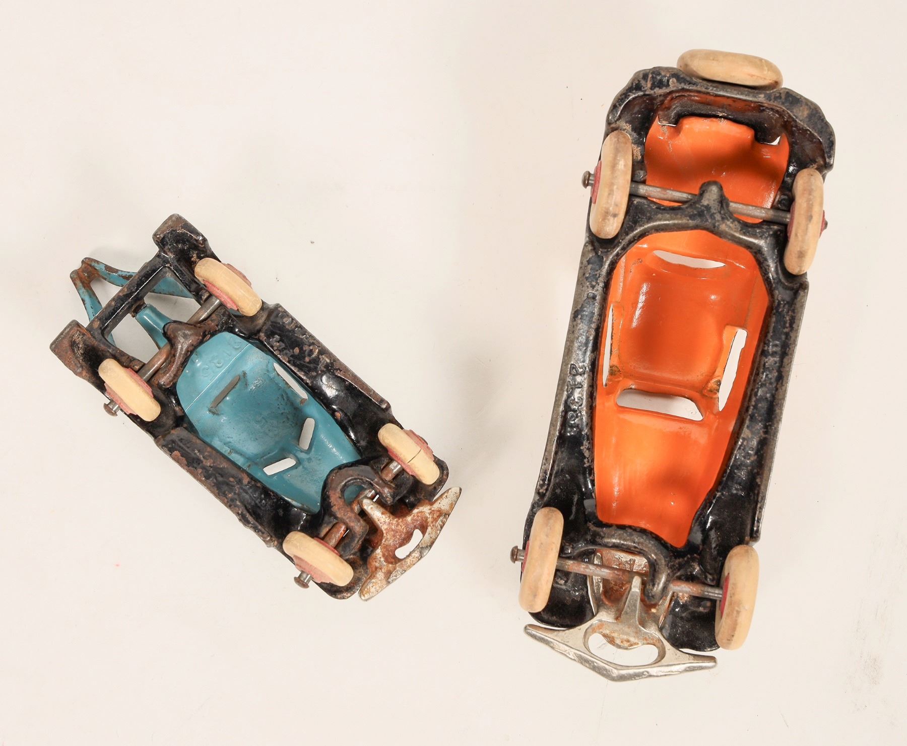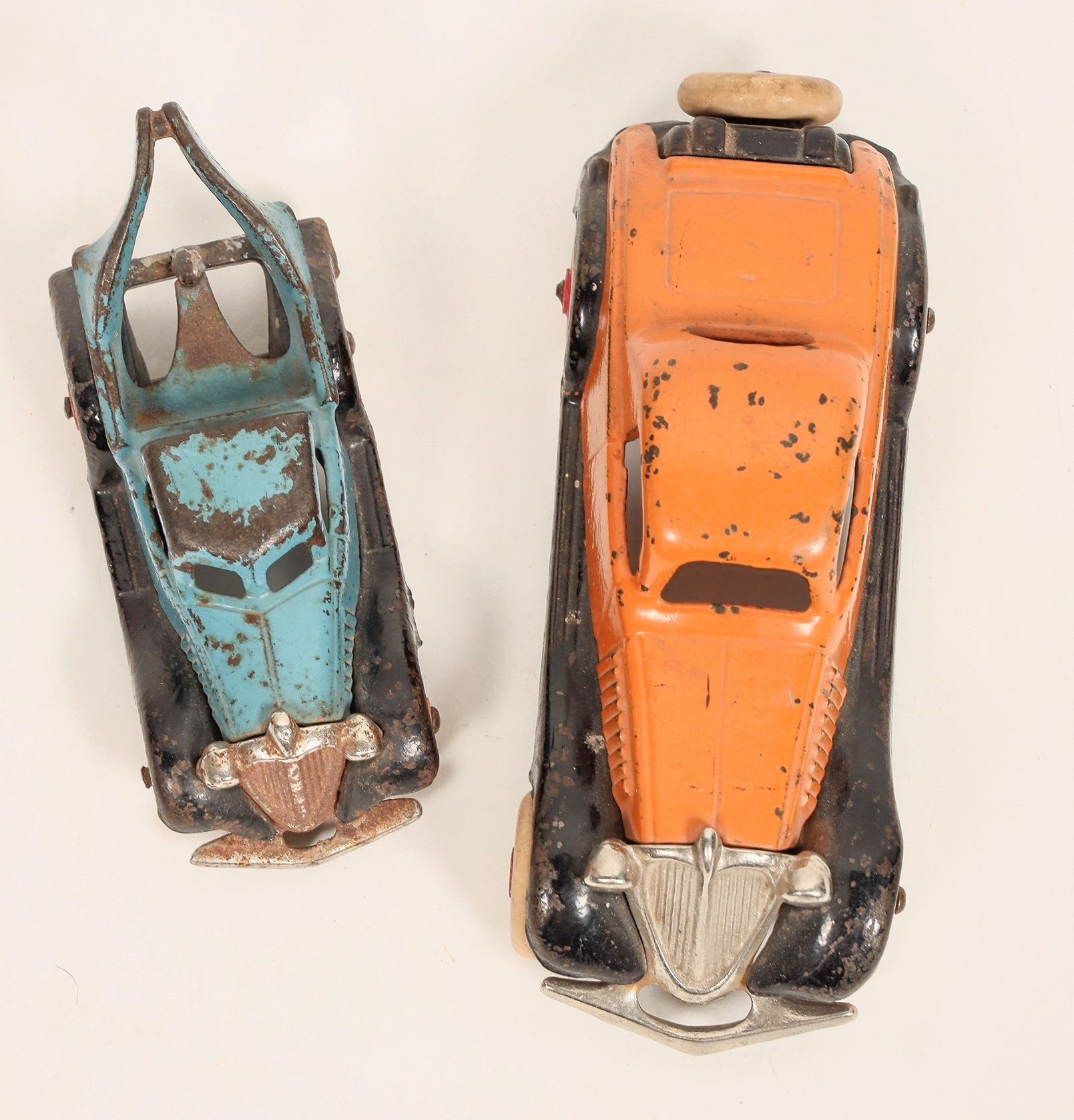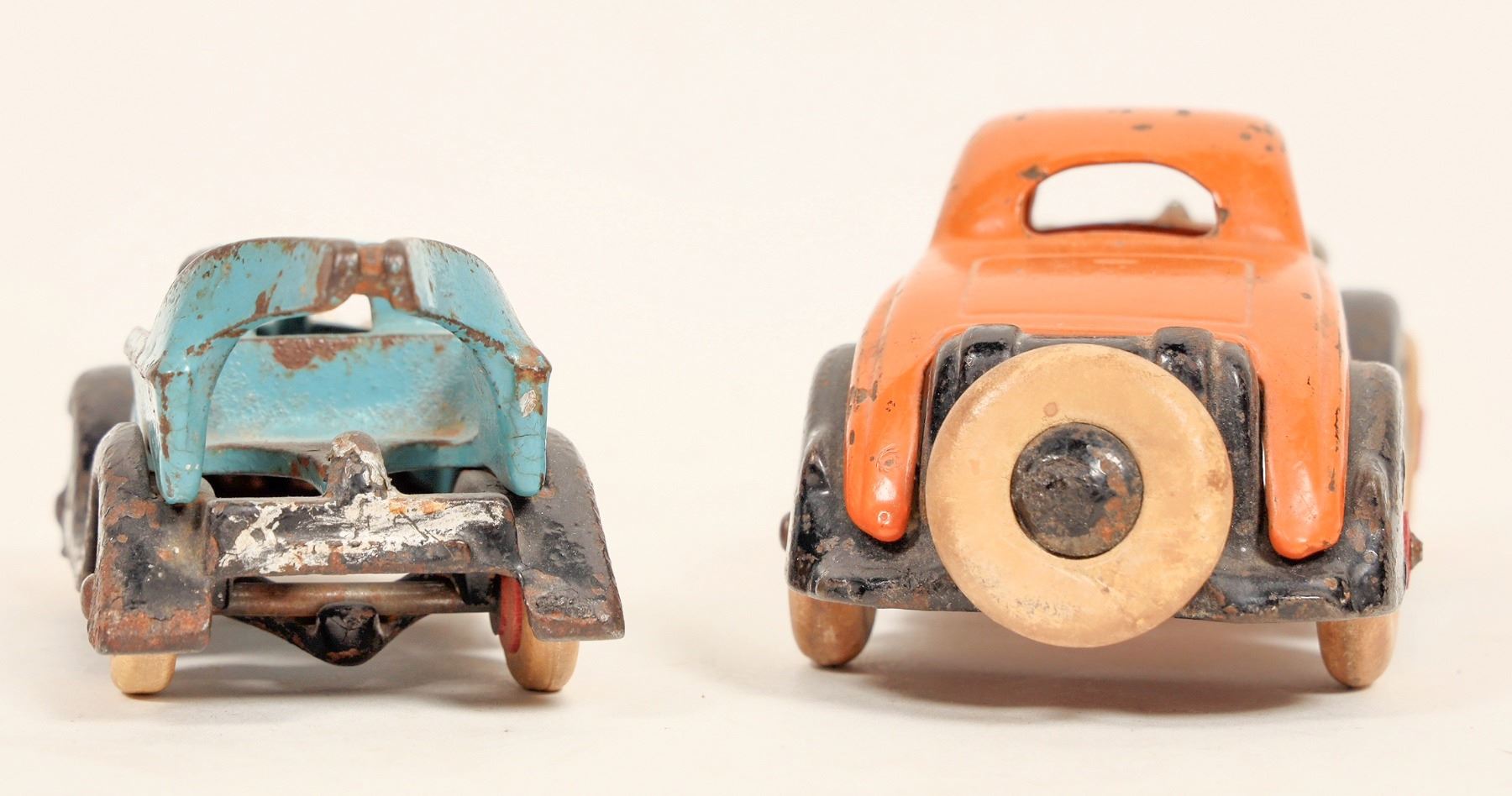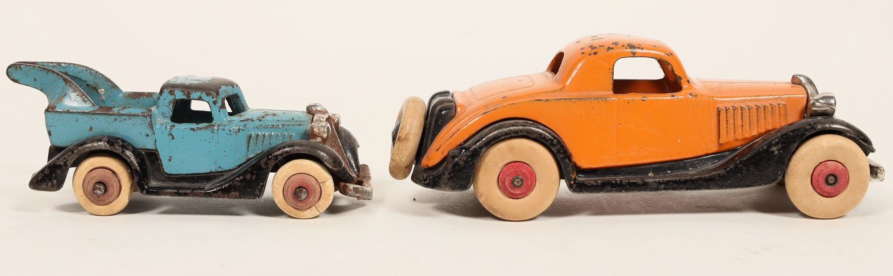 Lot of 5. . 1. Cast iron cannon. Burn paint is worn and red is showing. Wheels roll, missing the fillet. 2. Arcade RR gondola cast iron car. Wire couplers. Wheels roll. Has some sort of white residue, rust or patina. Overall good condition. 3. Hurley cast iron Studebaker (possibly ë33). Orange/black w/ very light wear. White rubber tires w/ red centers that roll, hover no cracks or damage including the spare. 4. B7P MFG. dime counter .