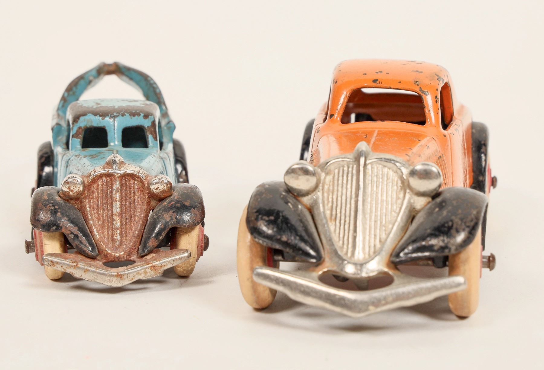 5. Hurley cast Iron tow truck blue w/black fenders which shows wear. Tires white rubber, two have small cracks. Overall cond. is very good.[