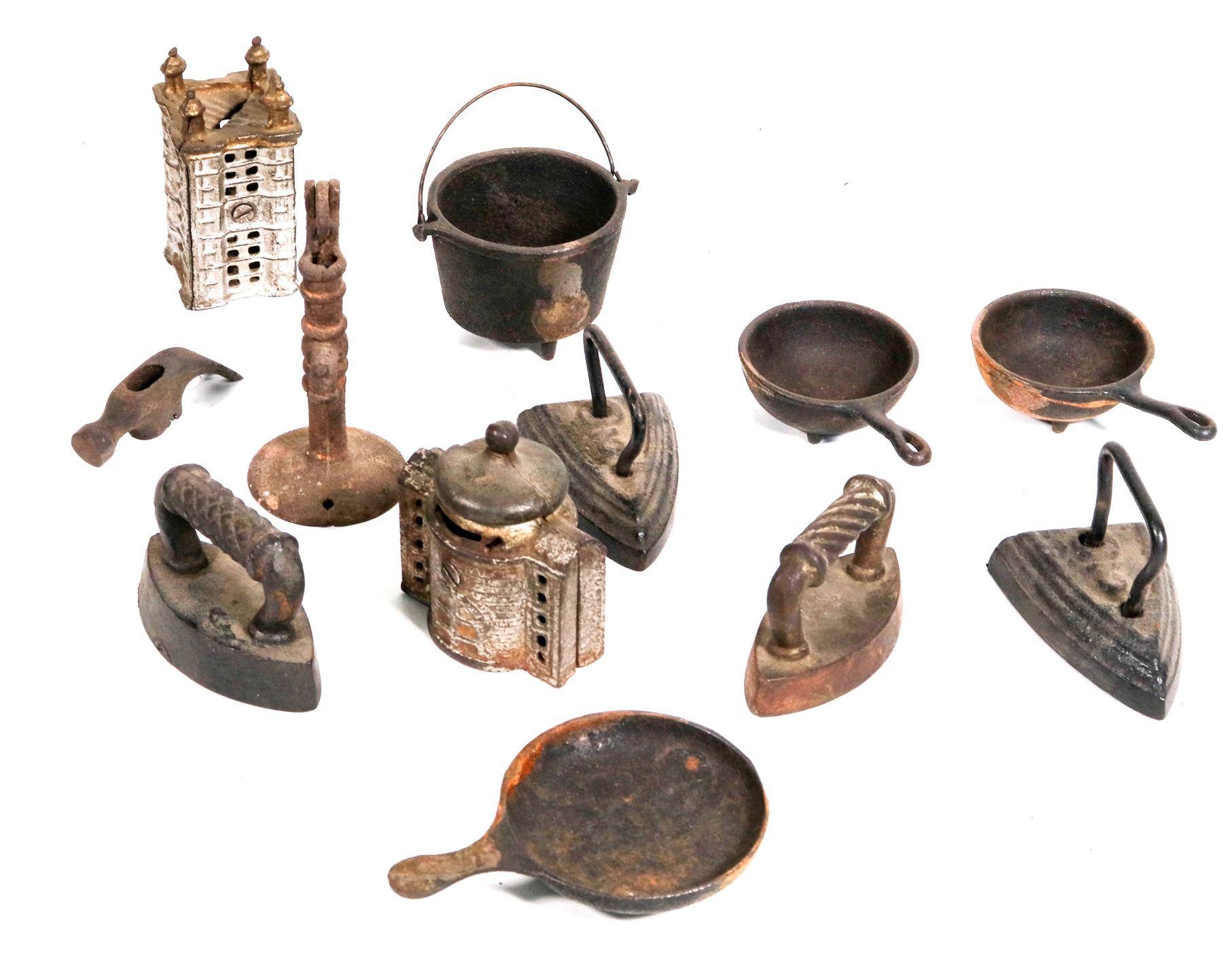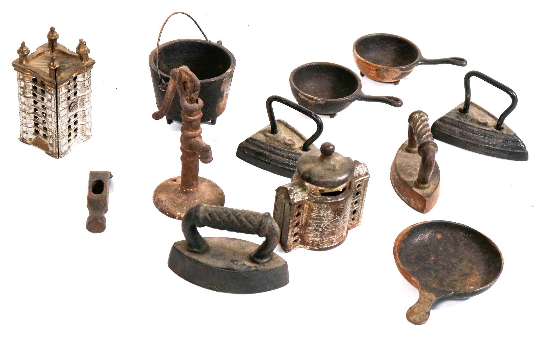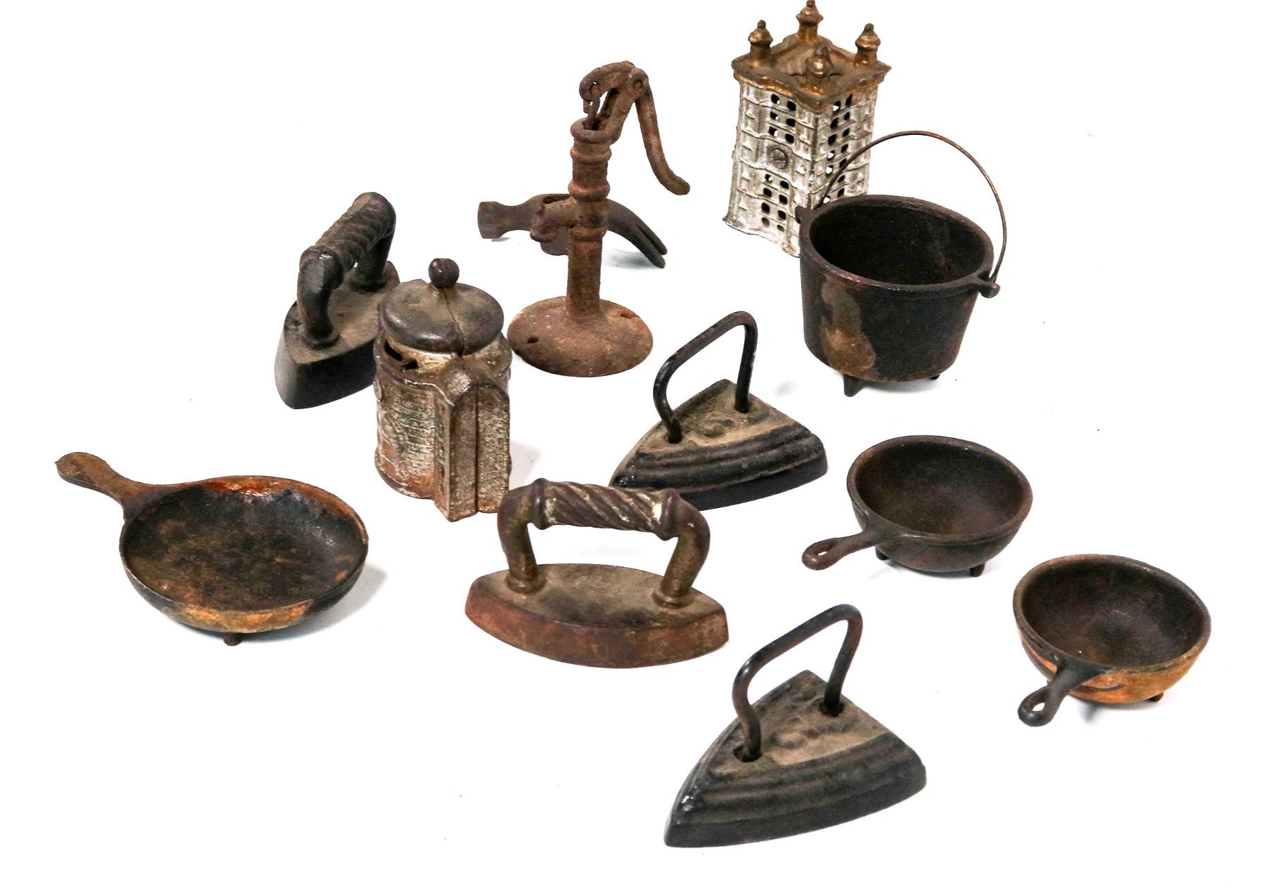 Lot of 10. Miniature cast iron pots, pans, flat irons , hand pump , claw hammer head. Probably vintage salesmans samples.They are in good condition, but will need to cleaned which will increase the value. Also, there are two cast iron banks in good condition