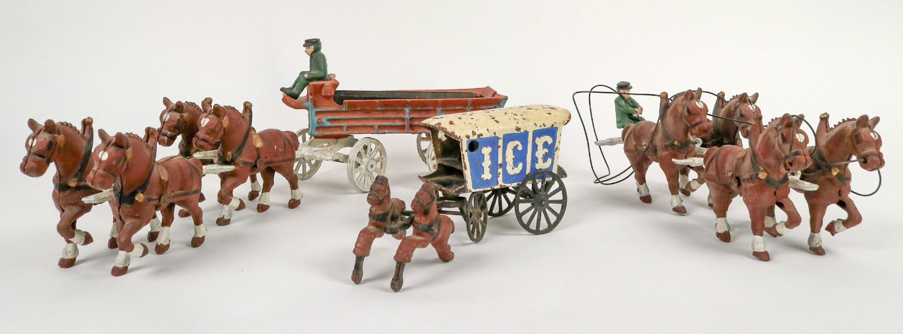 Lot of (2) vintage cast iron toy wagons and horses. There is an Ice Wagon drawn by a pair of smaller horses. The larger model looks to be a Beer Wagon, with (2) drivers and a dalmation dog, led by an (8) Clydesdale horse team. Driver controls long reins for the lead horses. All are hand-painted, with minimal chips, fade, etc. Rare. Overall very good condition. [ Cast