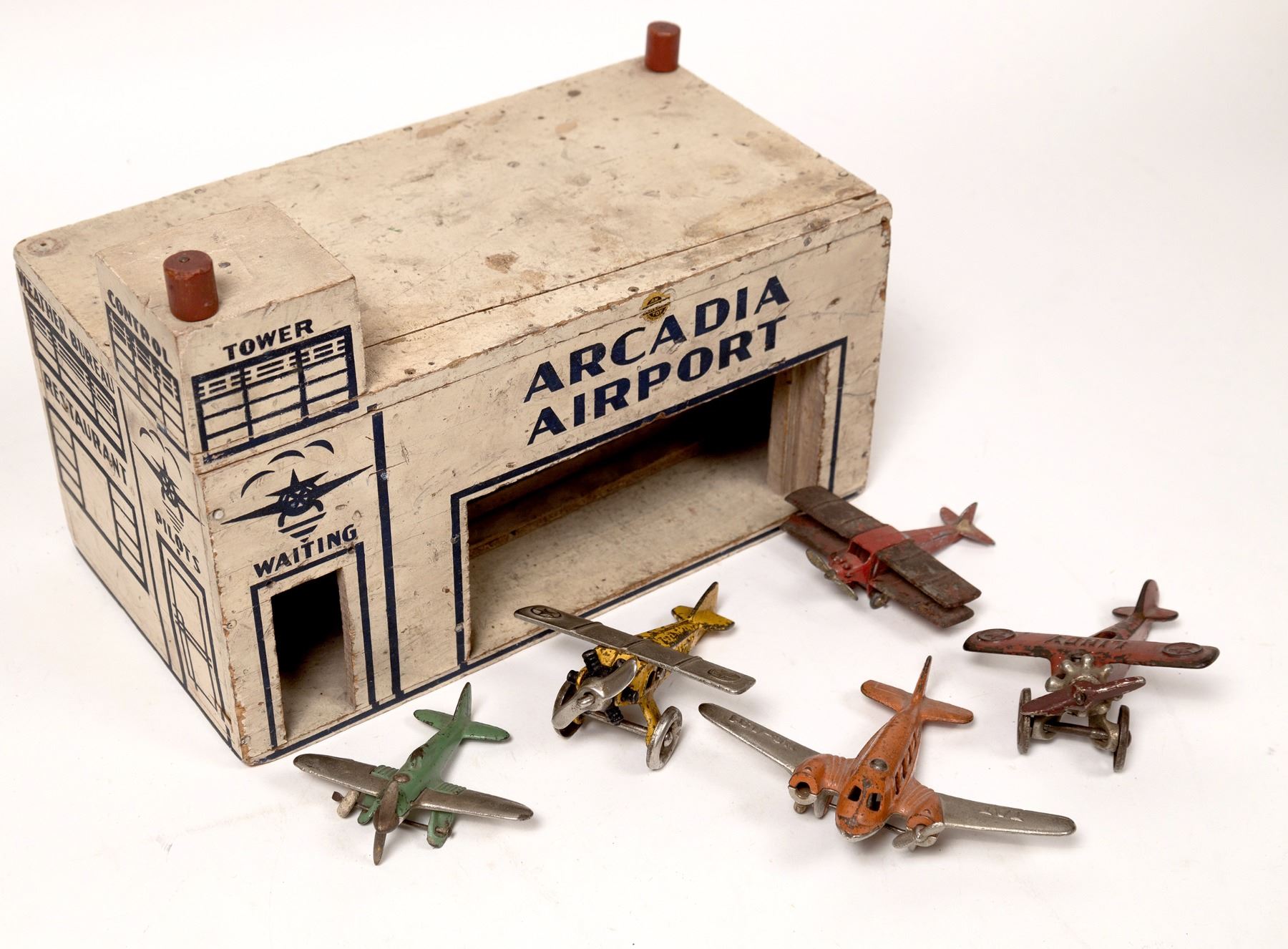 Wood hangar/tower, Arcadia Airport. 8.5"x12.25x7". Red metal Tootsie Toys biplane. Cast iron- red Lindy biplane. Yellow Lindy. Green Hubley. Orange Tat-missing 1 prop and wheel.