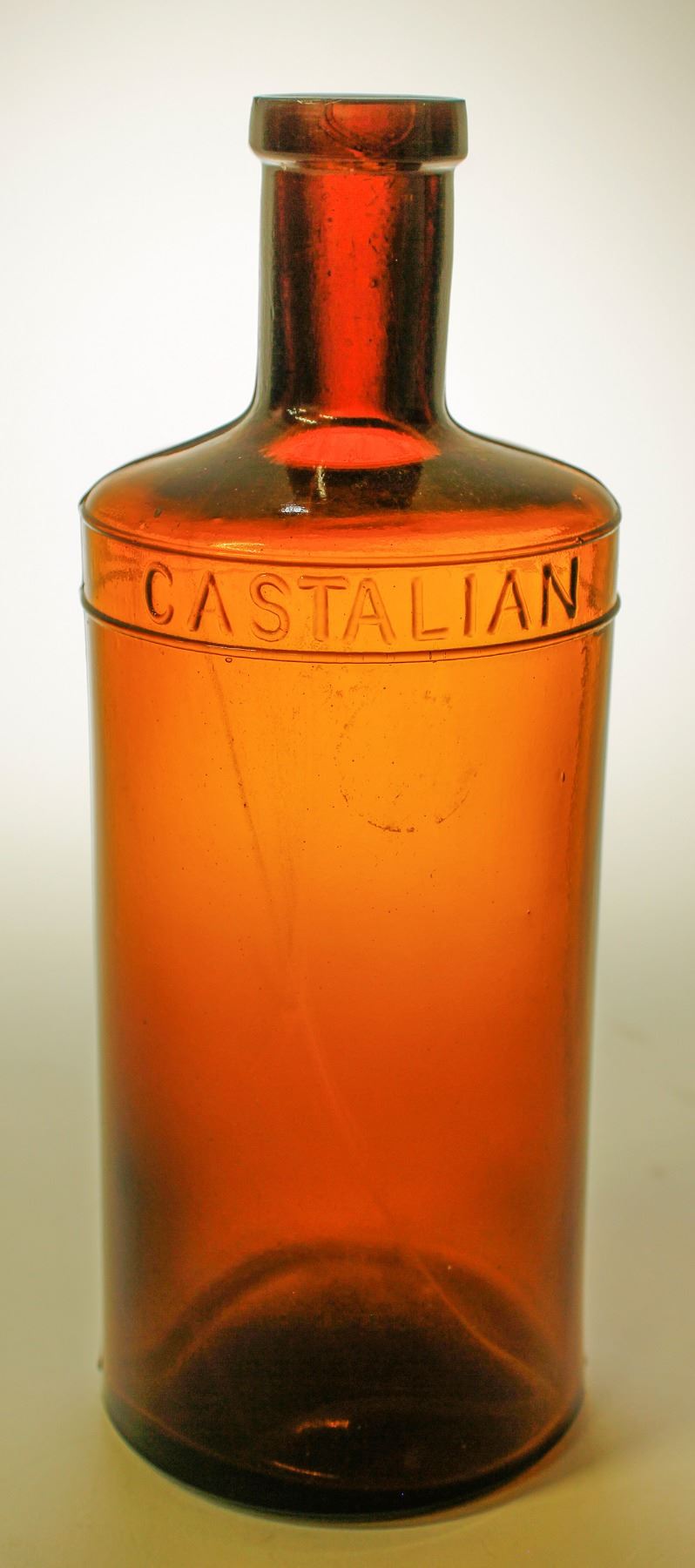 Well, here is a real rarity, a gem among jewels !!...Embossed around the shoulder is : " Castalian" / Cal. Nat. Min. Water // Light yellow amber, mineral water bottle, in a medicine bottle shape !! 7 3/4" tall, square collar top, tooled lip. Clean and shiny like a brand new bottle. Perfect except for a 1/8", shallow lip flake. Also has a streak of contents, that needs to be washed out. Otherwise, a a great rarity. This is only the second specimen, I have seen in 46 years as a collector.This bottle is mentioned in the book" Bottles of the East Sierra" by Tom Chapman. The other specimen was an earlier variant, aqua, and sold by us in august, 2016 for around $900.00...Don't miss this one, you may not get a chance at another ! ( RH). City: State: California Date: 1890's 1900.