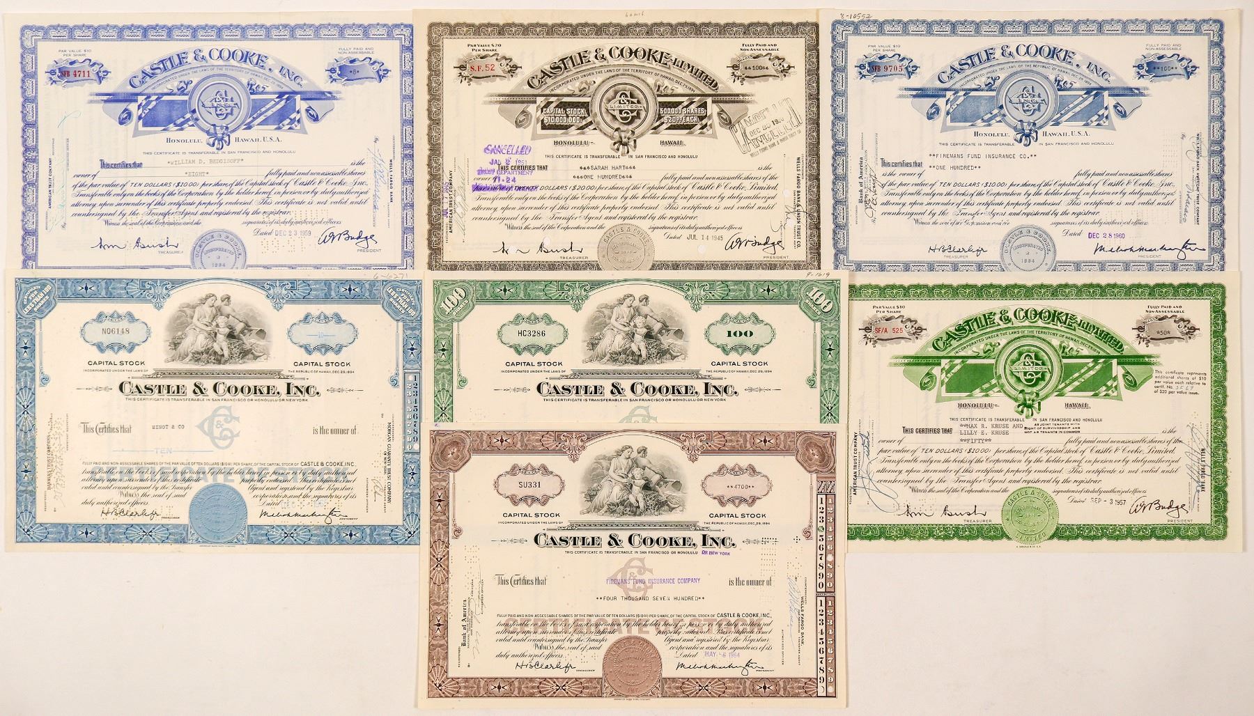 Lot of 7 issued stocks. Issued in 1945, 1957, 1959, 1960, 1964, 1965, 1966. All punch cancelled. Two different designs. Incorporated under the laws of the Territotry of Hawaii, Dec. 29, 1894. Castle & Cooke, Inc., is a Los Angeles-based company that was once part of the Big Five companies in territorial Hawaii. The company at one time did most of its business in agriculture including becoming, through mergers the modern Dole Food Company, the world's largest producer of fruits and vegetables. Founded in 1851 as a partnership between Samuel Northrup Castle and Amos Starr Cooke as a department store that sold farm tools, sewing equipment, and medicine. Joseph Ballard Atherton joined as clerk in 1858 and rose to become partner by 1865.Over the next few decades, the company invested heavily in Hawaii's sugar industry, running plantations in Kohala and Haiku. Atherton became president after the deaths of Cooke in 1871 and Castle in 1894, when the company incorporated. Ken Prag Collection