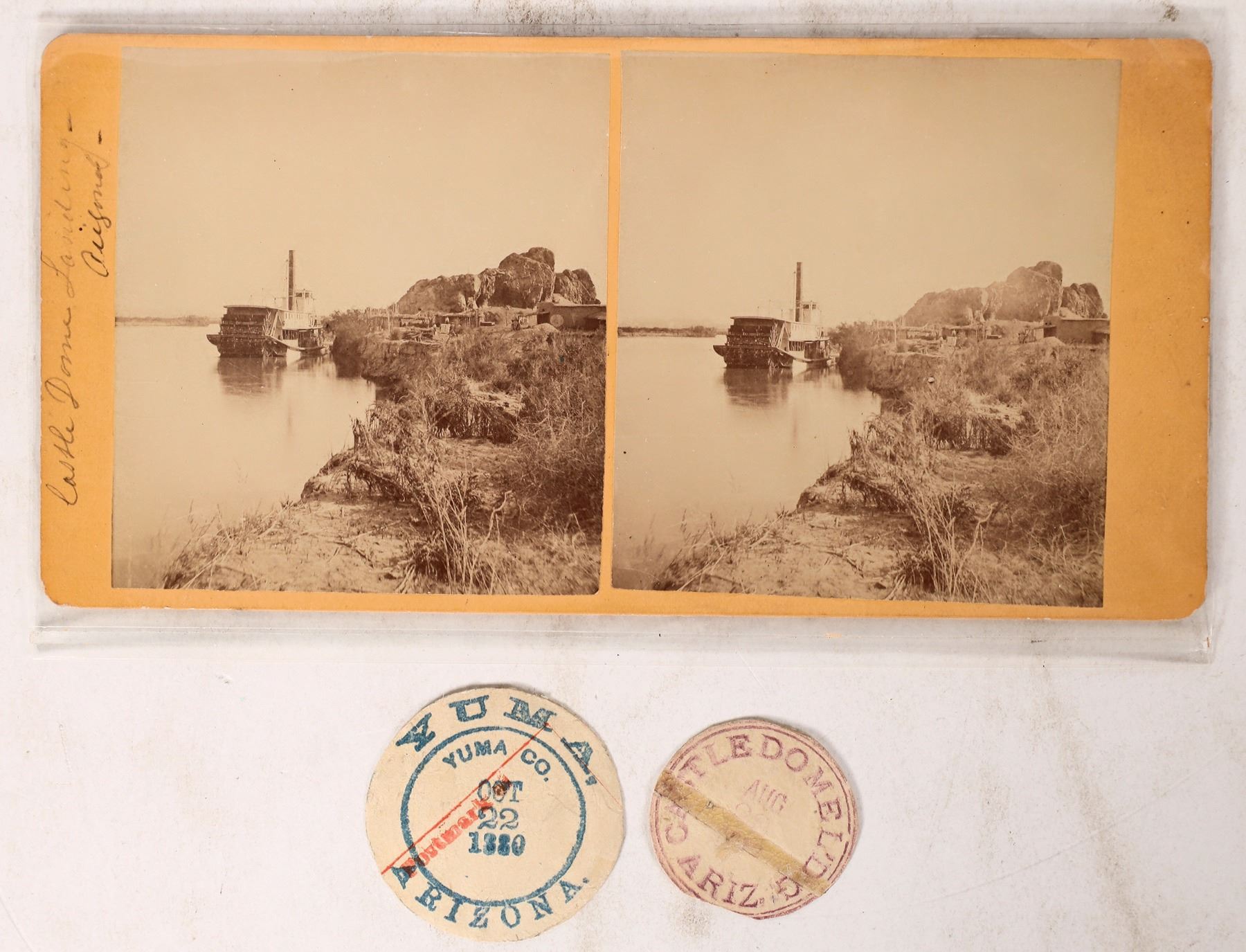 Castle Dome Landing on Colorado River at Yuma stereoview with a rear wheel paddle boat, c. 1876. Also 2 1880 Arizona Territory postmark cutouts. Castle Dome Landing Arizona