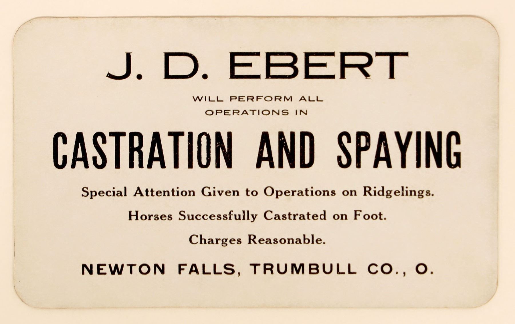 J D Ebert Castrations and Spaying Newton Falls, Trumbull, CO. In plastic sleeve.