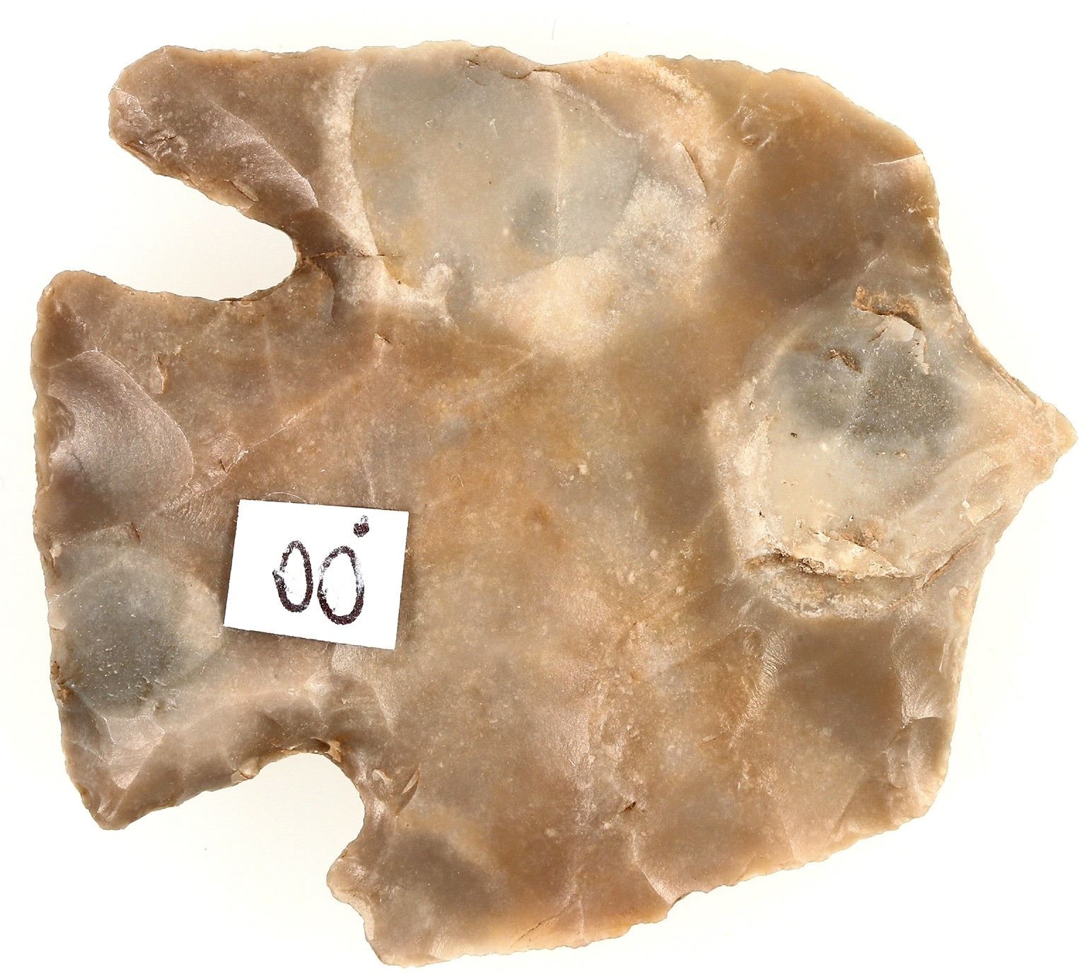 This is a Castroville Perforator point at 1.825 in./ 46mm in a light gold and cream colored chert. Found in Bell County, Texas. It has uneven barbs slightly flared stem and a flat base with a perforator tip. #8. Please see photo for details.