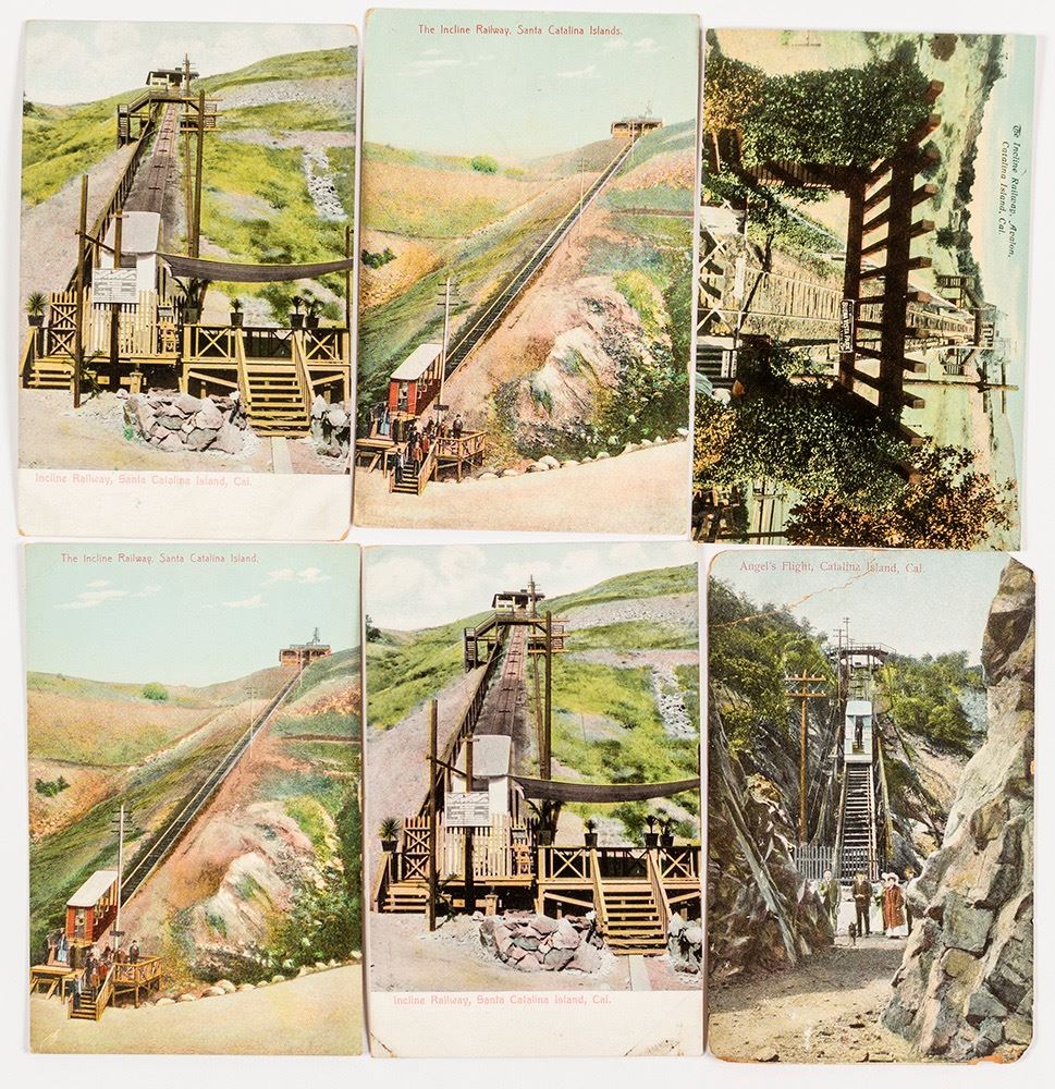Lot of six, four different. This unique Santa Catalina Island incline railway was built in 1904 to carry passengers up from the Amphitheater to the top of the mountain for the breathtaking view of the Pacific Ocean and the beautiful City of Avalon down below. Some stayed for lunch at the inn atop the hill. Others dashed into the other incline car for the spectacular ride down the other side of the mountain to Pebble Beach in Lovers' Cove. It ran from 1904 to 1918 and again from 1921 to 1923. HWAC# 51482 Date: c1910's Location: Catalina Island, California