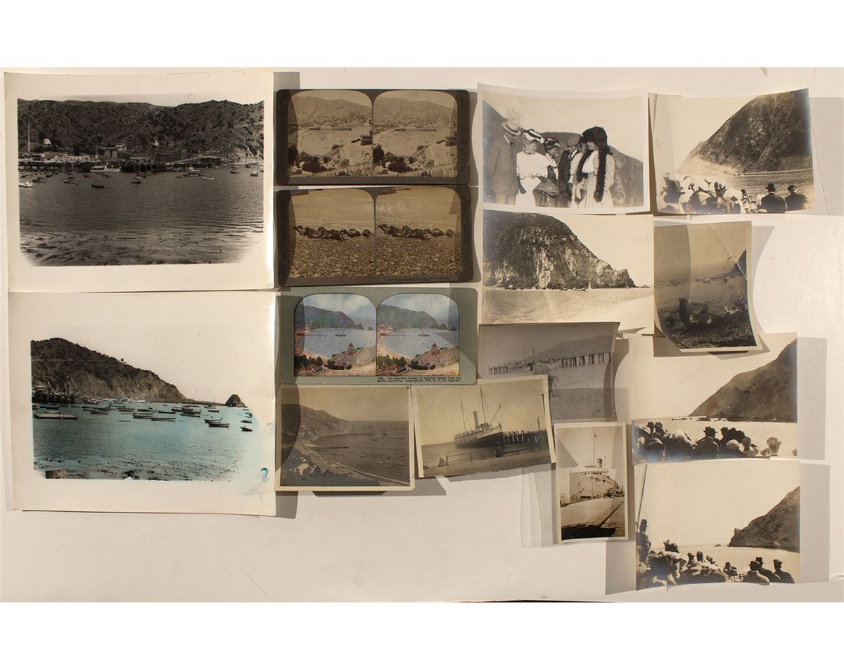 Nine snap shots, two stereo views, 2 8x10 b&w photographs of various views at Catalina. People, sea lions, ships, etc. Fine.