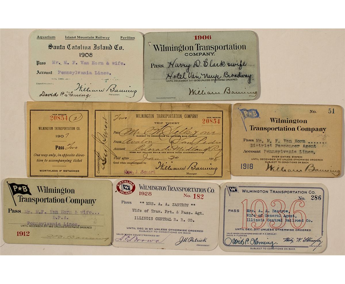 Six annual passes and one trip ticket. Santa Catalina Island Co., 1908 (rare); Wilmington Transportation Co. 1906, 1912 1918, 1928, 1936. Same company ticket, 1908. Very Fine.