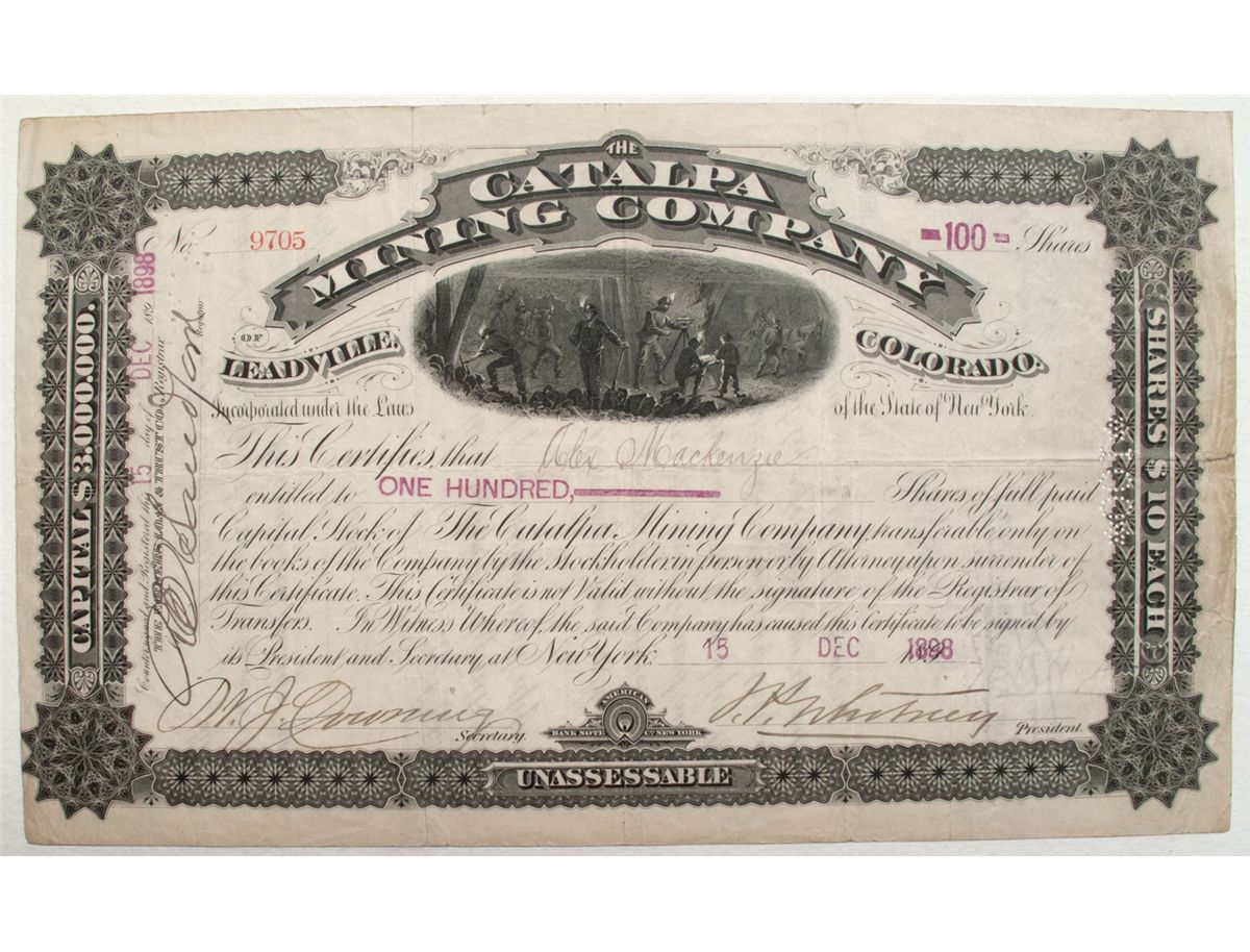 Incorporated in New York. Cert. #9705 issued to Alex Mackenzie for 100 shares. Signed by J.P. Whitney, president, and W.J. Downing, secretary. Central vignette of miners underground. Black border on crme paper. U/C. Printer: American BNCo. Of New York. Datelined New York. On reverse there are three brown adhesive stamps, two ten cent and one 25-cent, imperf, U.S. Documentary. Cancelled by hand stamps. Some crinkling on margins and slight discoloration at right end. Whitney and Downing were also officers of the Crescent Mining Company. VF. Date Leadville, CO hwac 9975