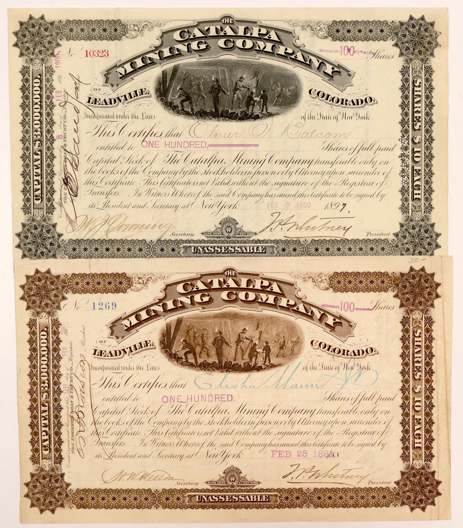 Lot of two different, both signed by JP Whitney as company president. Issued in 1881 and 1900, neither cancelled. Black or brown borders with the same underground mining vignette. Folds, pinholes, creases. 7 x 11.25" The Catalpa Mine was located on Carbonate Hill between the Crescent and Evening Stare. According to C&L, they owned two fractional claims covering on 7 acres situated on Carbonate Hill adjoining the Evening Star in the California District. Joel Parker Whitney was a millionaire and very important figure in Colorado (and Wyoming, New Mexico and California) history. He made a fortune in the California Gold Rush as a merchant before heading to Colorado Territory in the 1860s. He authored an 1865 book on Colorado silver mining that many believe helped establish statehood. He continued to make money in the mining and railroad industries, as well as real estate in California and ranches in New Mexico. Ken Prag Collection