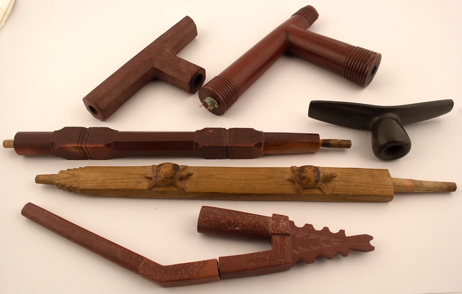 Five Catlinite Pipestone Pipes and pipe stem. These pipes are made of solid sacred catlinite, found in Minnesota. 1) vintage octagonal "T" pipe, 7. 5". 2) Polished and incised "T" pipe. 8.5". 3) Modern looking "T" pipi, has small chip on mouth end. 6". 4) Long pipe, carved and shaped. 13". 5) "V" shaped, and angled with design at crux, 13". 6) Wood pipe stem, nicel carved with turtle effigies, 15.75". All are in good condition. City: State: Minnesota Date: HWAC# 50741
