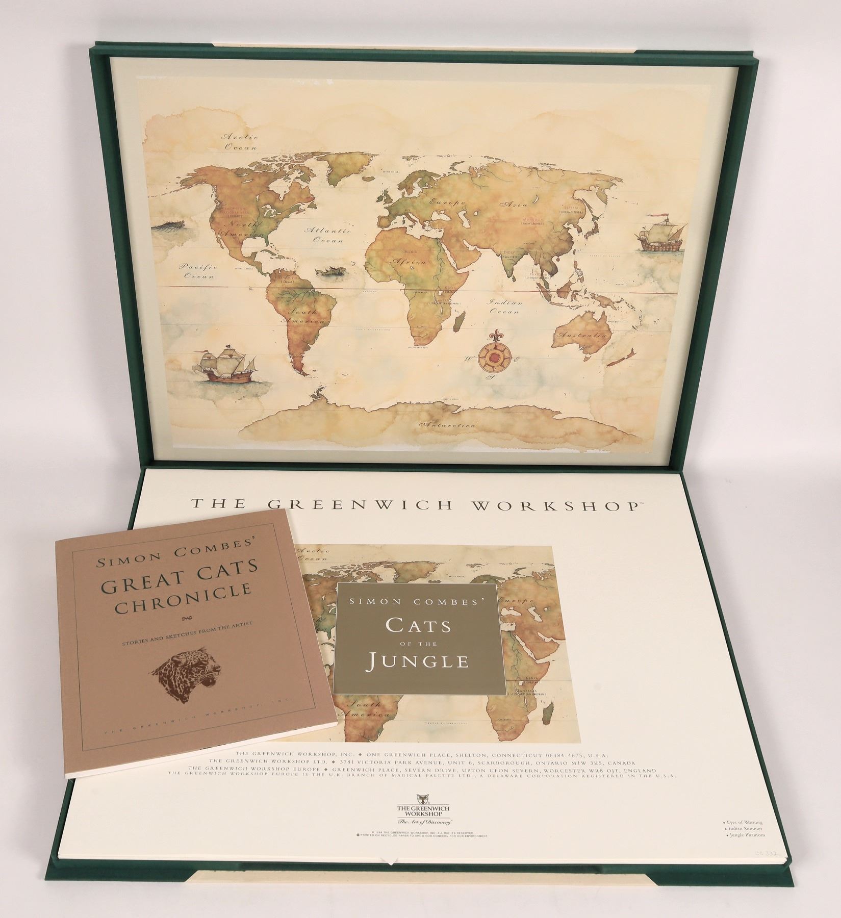 Deluxe hard folio, Cats of the Snow by Simon Combes, with Great Cats Chronicle, Stories and Sketches From The Artist softcover book. This great set is from The Greenwich Workshop, Shelton, CT, 1995. The 3 prints are Mountain Myth(unsigned), Siberian Winter #332/500 and signed by artist, Snow Tracker #332/500 and signed by artist. COA included. These beautiful prints are worthy of being framed and displayed. Prints are 29x21.5". About 19lbs total.
