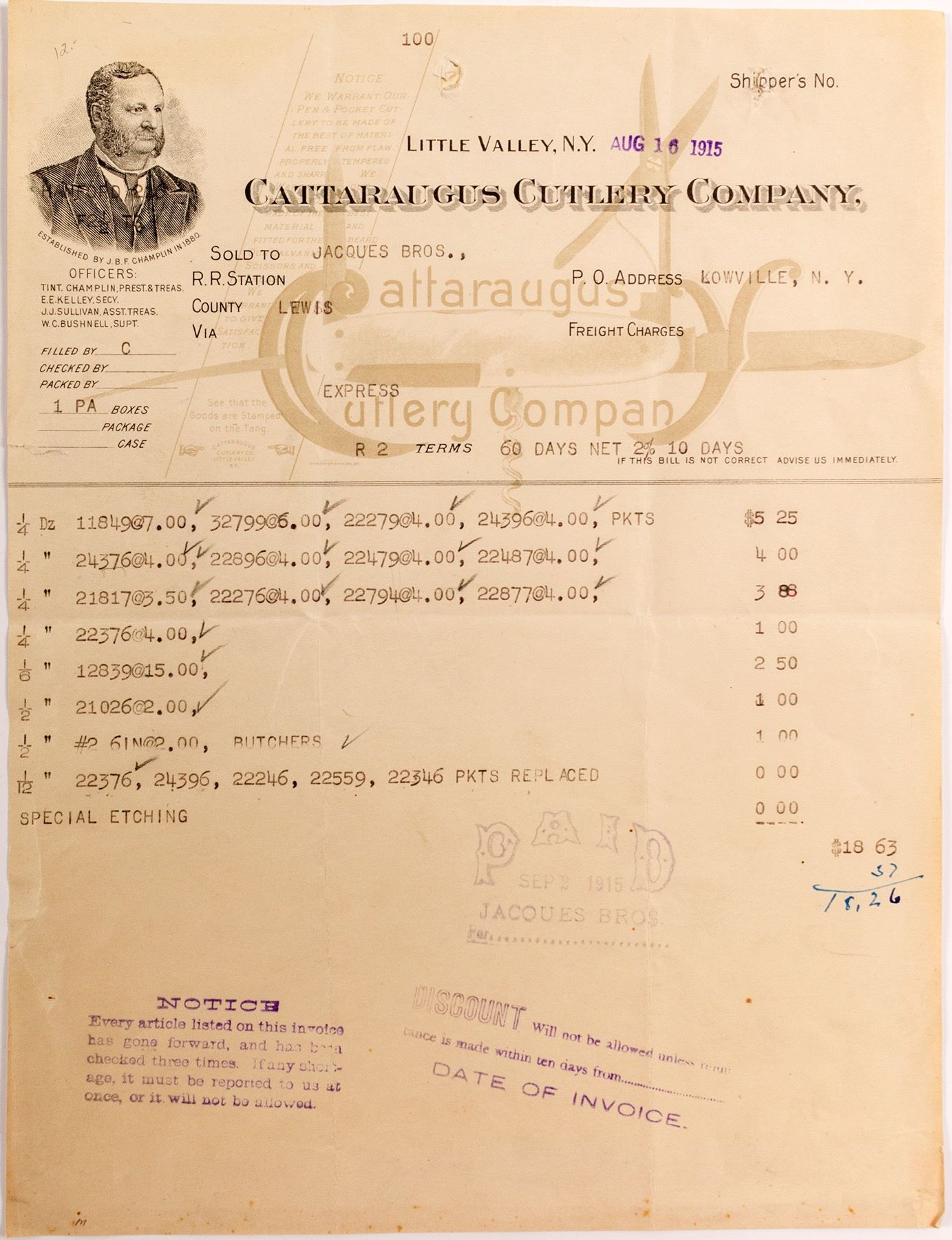 Bill head from Cattaraugus Cutlery Company to Jacques Bros. of Lowville, NY for a total of 25 parts totaling $18.63 State: New York City: Little Valley Date: 1915