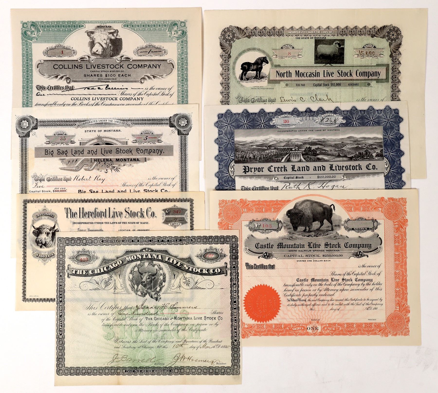 7 cattle stocks with low cert. numbers from the personal collection of Stuart Mackenzie. Big Sag Land and Live Stock, Collins Livestock, Hereford Live Stock, Chicago & Montana Live Stock, Pryor Creek Land and Livestock, Castle Mountain Live Stock, North Moccasin Live Stock. c. 1895 to 1918.