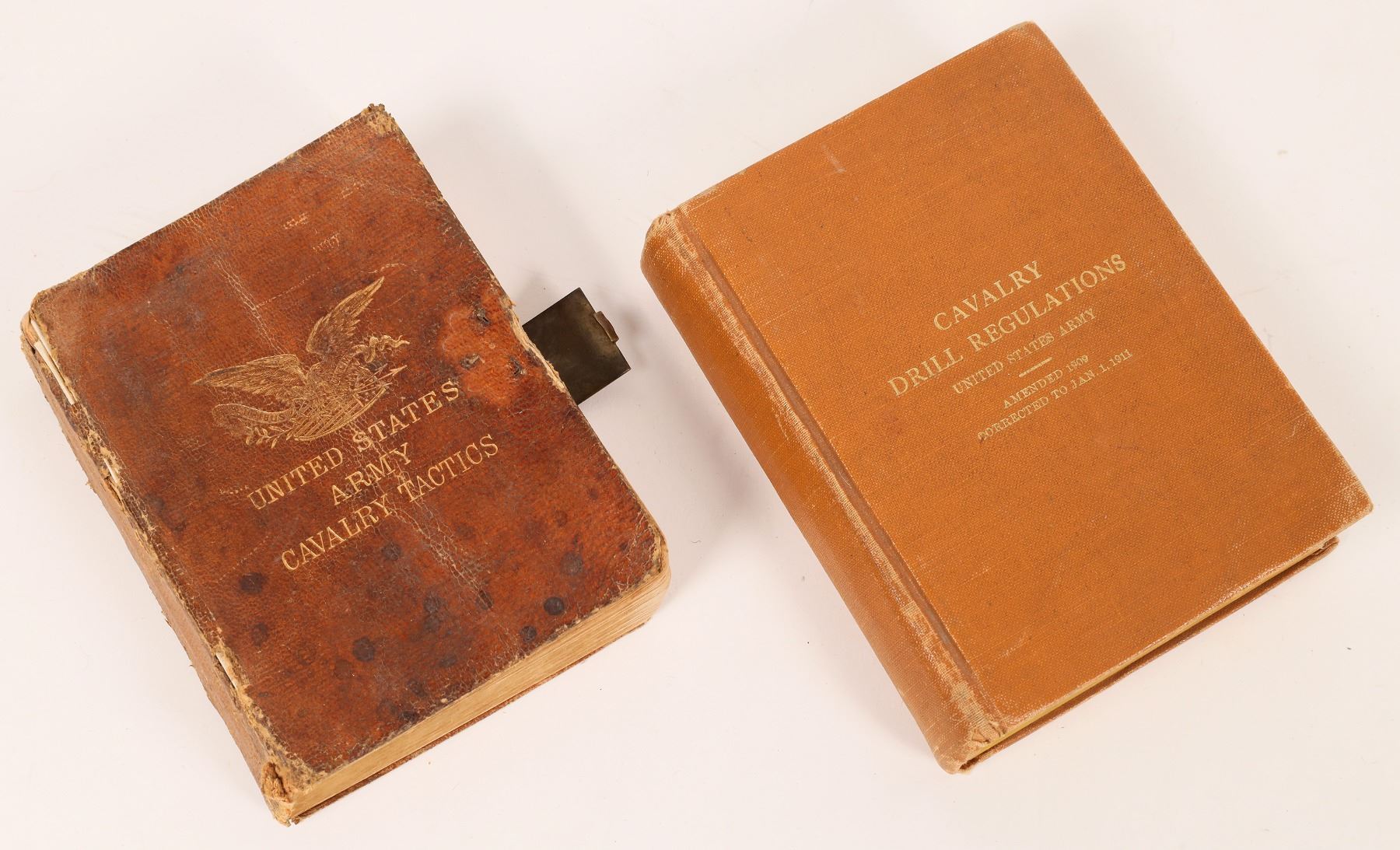 This lot holds two books of U.S. Army Cavalry operations. "United States Army Cavalry Tactics" from troop "K, 8th U.S. Cavalry", c. 1876. It has a repaired binding, pp.530. Includes songs and bugle messages. The second book is "Cavalry Drill Regulations United States Army" amended 1901 corrected 1911. pp. 514. Assigned to Troop "D, 1st Cavalry" Division. Signed inside cover: "C.P. Firestone", "Custer Fletcher". The back inside back cover is signed by "O Rourke". Repaired binding. 4in. X 5in. Rounded corners, good condition. From the Sherman collection.