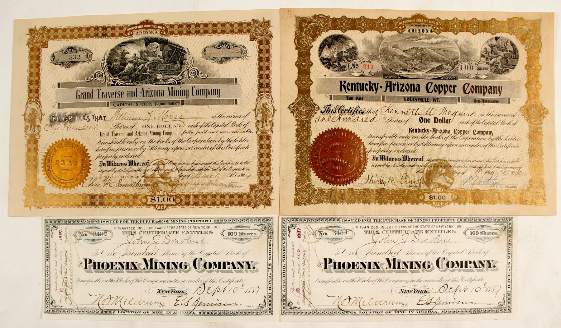 1-2) Consecutively numbered Phoenix Mining Company stocks. 1887. No issues except fading through the 'Arizona' on one stock. In 1892 Rothwell reported that the company had finally settled its plans and was finally erecting a mill. Page 101 in Garbani. 3) Kentucky-Arizona Copper Company. 1906. Successor to Kentucky-Arizona Consolidated in 1905. Ore shipments were always low grade. Page 95 in Garbani. 4) Grand Traverse and Arizona Mining Company. 1904. In 1906 the company was in high gear with assays at 5% to 35% copper, 8 to 12 ounces silver, and $8 to $120 gold. Page 95 in Garbani. City: Maricopa, Cave Creek District State: Arizona Date: