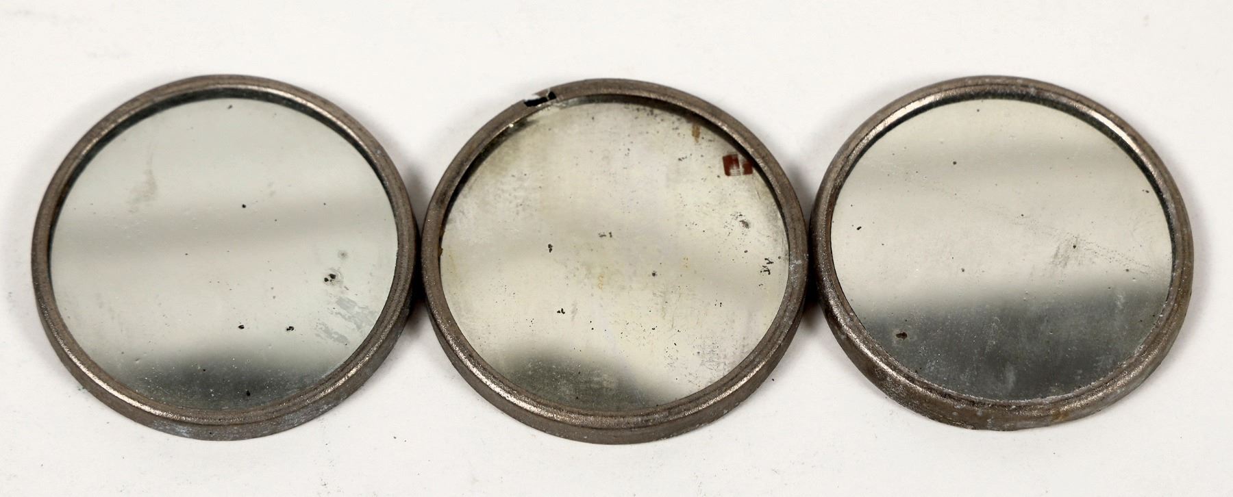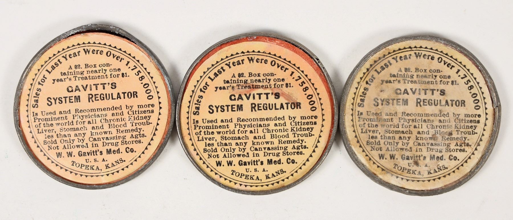 This is the early (first) type of advertising mirrors: three 48 mm metal circles with reflective glass on one side, and cardboard advertising for Cavitt's System Regulator, for all chronic kidney, liver, stomach and blood troubles than any known remedy.