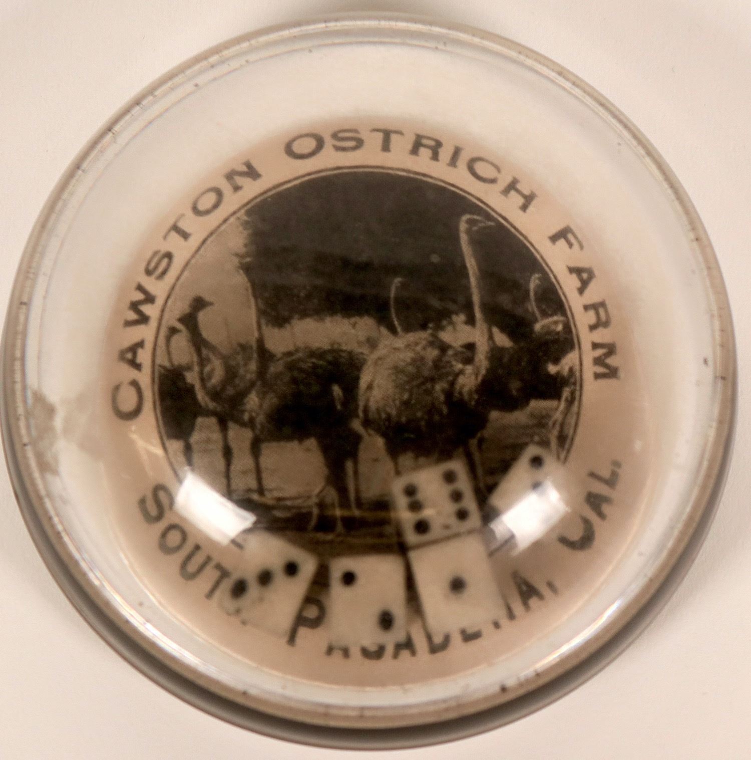 America's first ostrich farm opened by Edwin Cawston in 1886 outside Los Angeles with 50 birds he shipped from African to Texas, then put on a train to California. Cawston Ostrich Farm went on to became a famous tourist attraction. The bottom of this heavy, concave glass paperweight dice game has a patent date of Aug. 18th 1903. Under the glass is a circular label that reads: "Crawston Ostrich Farm" on the top edge of the circle and "South Pasadena, Cal." on the bottom with a sepia toned picture in the center of 4-5 ostriches. Highly collectible early advertising piece.