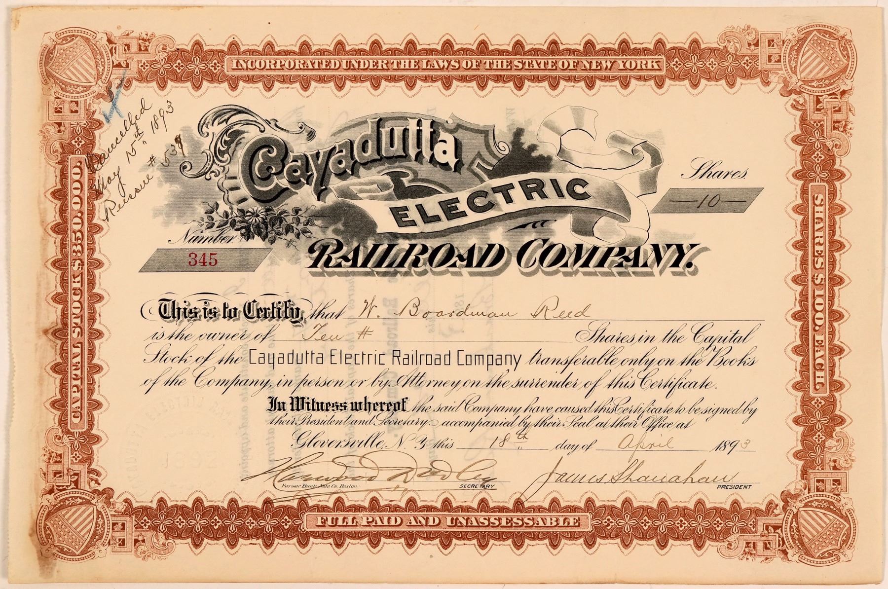 Cert. #345, issued for 10 shares. Fancy scroll in title with flowers. Shields in corners. Issued to W. Boardman Reed and signed by James Shanahan as president. Black on creme. Black pen cxled.