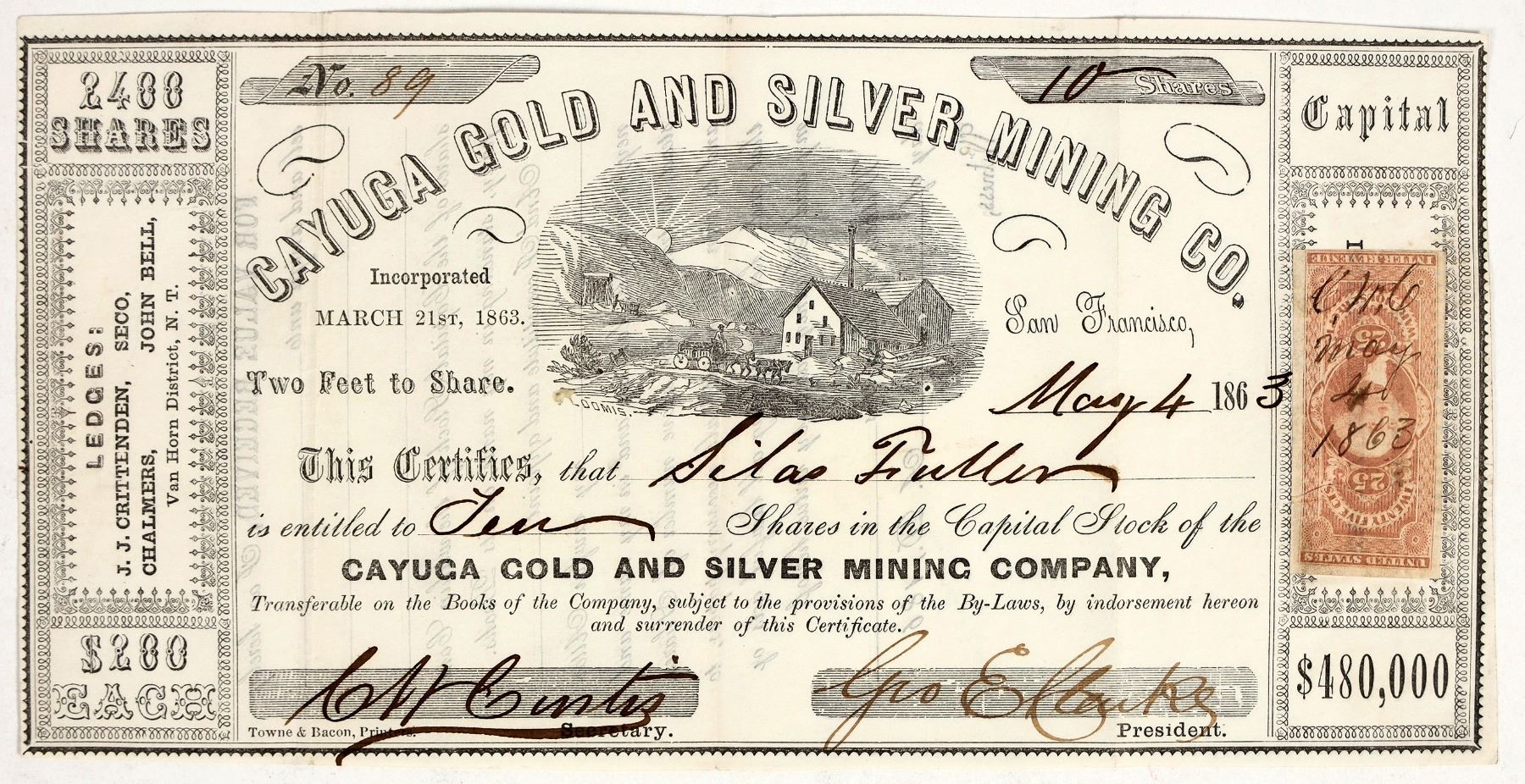 I/U. Cayuga Gold and Silver Mining Co. Stock, issued 1863, 25c revenue stamp right side. Located in the Van horn District, Nevada Territory, although at the time the lines between Calif and Nevada weren't well defined and both states claimed the district. A story of the mine is included. Towne & Bacon printers. Excellent cond. This is a rare Nevada Territory Van Horn District stock. The two mines most closely associated with this short-lived mining district were the Bullion and the Crescent. Stock certificates from both clearly state that the companies thought they were in Mono County, California. The district was next to the famous Esmeralda District and directly above the Montgomery district. The district ended any real importance in February of 1864 when the Bullion mine "gave a final test by sending a few tons of rocks to be crushed, which did not pay over one-half the expense of hauling. We always considered that district too risky for investments." [Mining & Scientific Press].