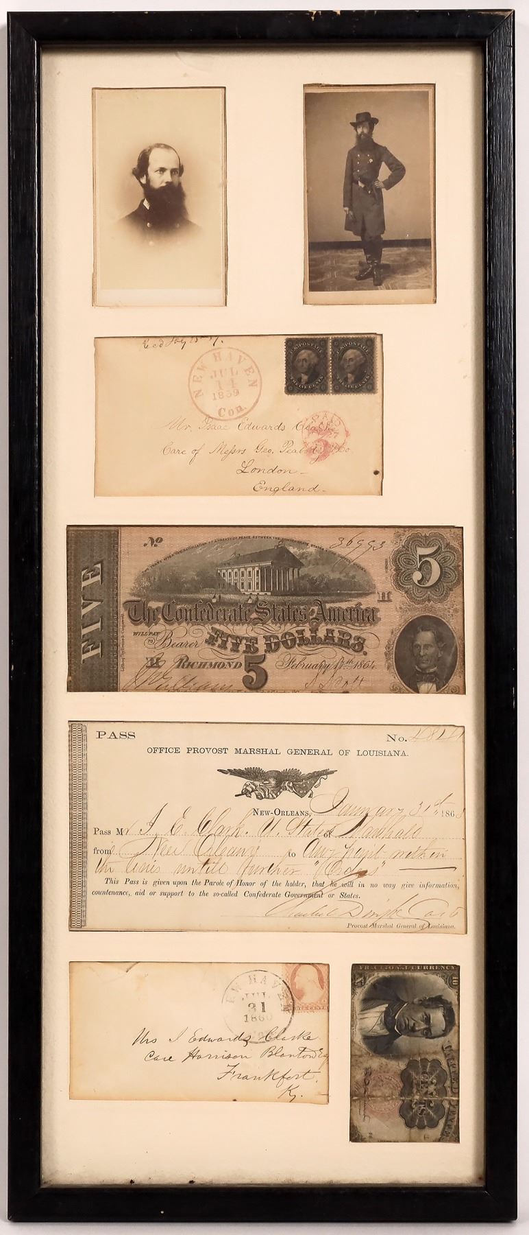 This frame is a collection of two CdVs of Colonel Isaac Edwards Clarke of the Union Army. He worked in London with George Peabody a banker and philanthropist before the Civil War. Later, became Provost Marshall of New Orleans during the war. There are two CdVs of I.E. Clarke, two cover letters to/from him (1859, 1860) and one Pass from the Provost Marshal General's office of Louisiana date January 31st, 186(5). Two pieces of Confederate paper money are also shown. He was responsible for confiscating Confederate goods. Framed at 9 in. X 21 in. Please see photo for details.