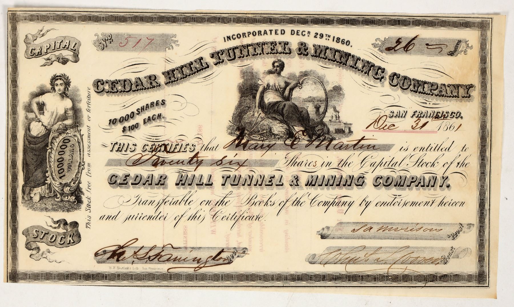 Extremely early! Inc. Dec. 1860 (when it was Utah Territory). No. 517, issued for 26 shares to Mary Martin in San Francisco in December 1861 (Nevada Territory had just been formed in March). Signed by president Morrison, treasurer Coover, and secretary Farington. Not cancelled. Two allegorical vignettes. BF Butler Lith., SF. 5.75 x 10" Folds, clean. On February 7, 1861 (one week after incorporation) the Daily Alta California took special note of this company. It proposed to dig a tunnel 2,000 feet into the mountain which would arrive some 1,600 feet below the surface of the mines. That would allow for drainage and open up a great number of new leads. The tunnel is to be seven feet high and five feet in width. Hugh Shamberger in his work "The story of the water supply for the Comstock" notes that the tunnel was built to 2,000 feet, but with no indication of any success it was abandoned. In 1876 the Phil Sheridan Mining Company bought out the Cedar Hill Tunnel Company.