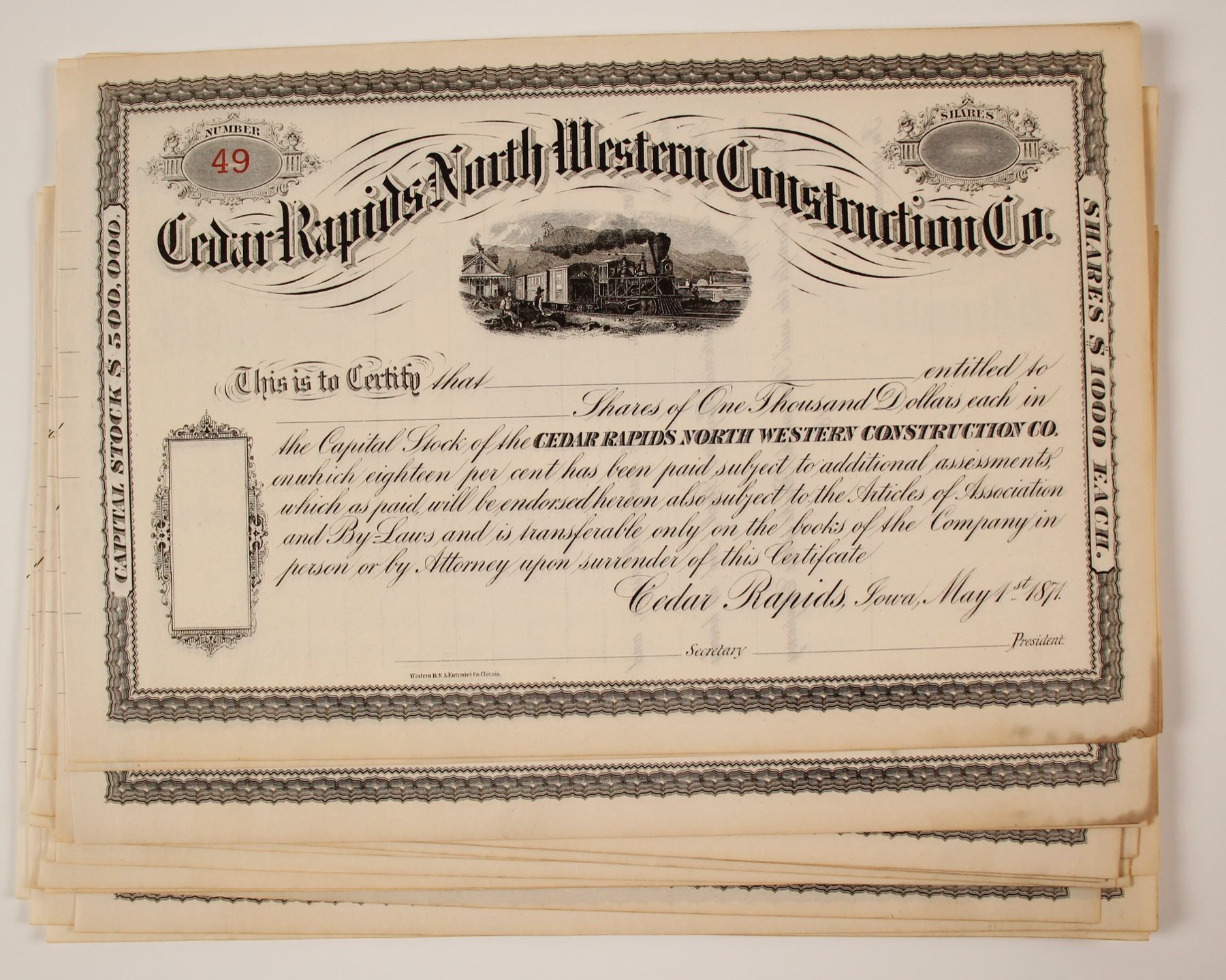 28 total certificates. All unisued and unsigned; all in very good condition. Prag Collection. City: State: Date: HWAC# 79661