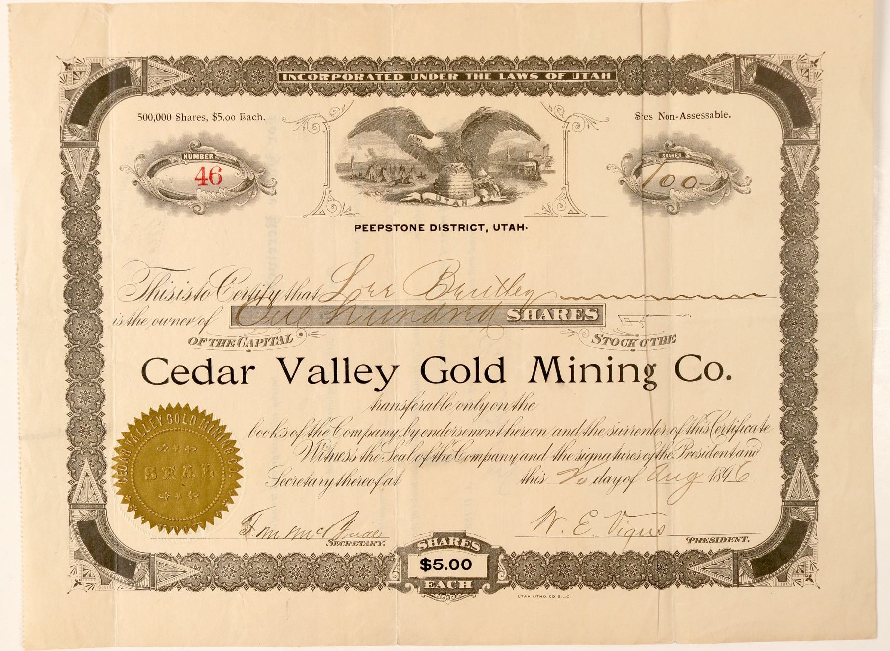 Cedar Valley Gold Mining Co. Stock Certificate (100787)