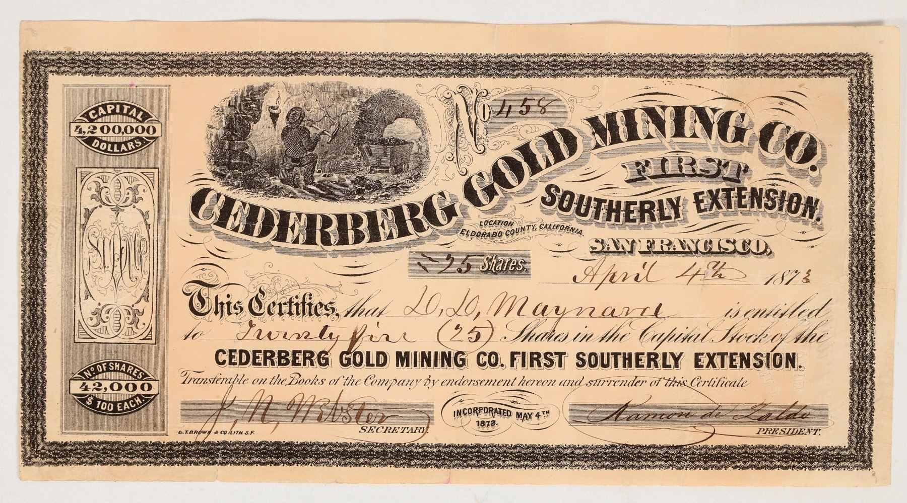 "location El Dorado County, California" printed under title. Inc. 1872. No. 458, issued for 25 shares to LL Maynard in 1873. Signed by president Ramon del Zaldo and secretary JN Webster. Not cancelled. Black border and print with underground mining vignette. Lith. by noted African-American lithographer GT Brown. Pinholes, many folds, toning. 5 x 9.5" The Cederberg Mine, with its First Northernly & First Southerly Extensions, was located at Spanish Dry Diggings, two miles north-northwest of Greenwood, El Dorado County, California.