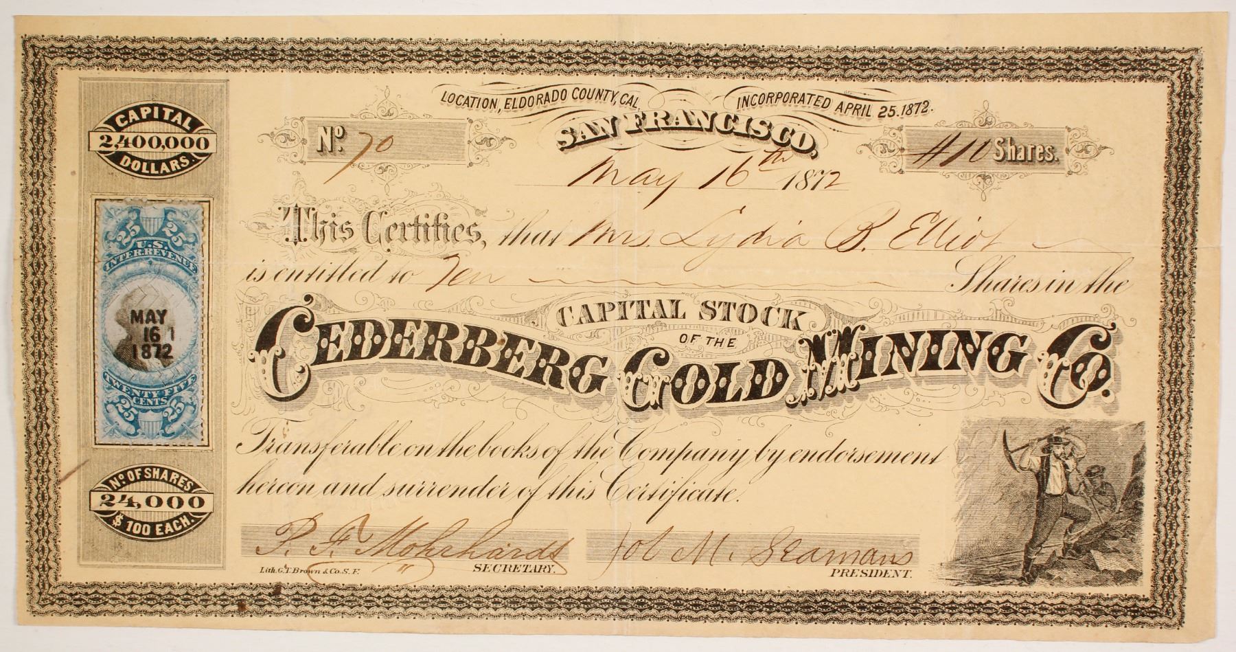 # 70 for 10 shares to Mrs. Lydia V Elliot. Signed by PF Mohrhards and Job M Seamans as president. Dateline San Francisco 1872. Incorporated April 25, 1872. 25c blue Revenue stamp. Shares $100 each. Black on Brown. Not cancelled. GT Brown printed. San Francisco's famous African American lithographer. Some age ear and light staining.Folds. Same vignette, miners with picks, as other Cederberg stock certificate. Cederberg Quartz specimens were being sold on June 1, 1872 by Job M Seamans, president of the Cederberg Gold Mining Company. SEALED [Daily Alta California] Prag Collection State: California City: El Dorado County Date: 1872